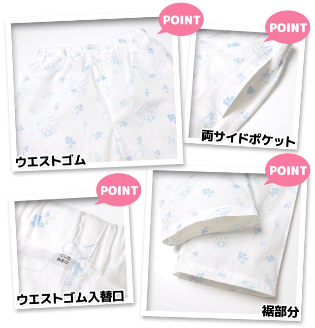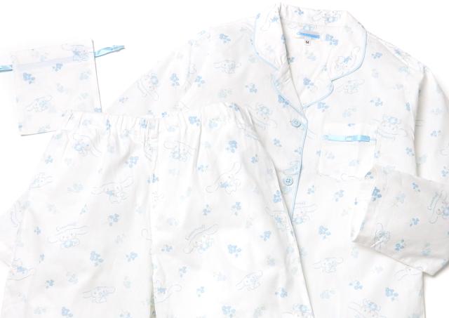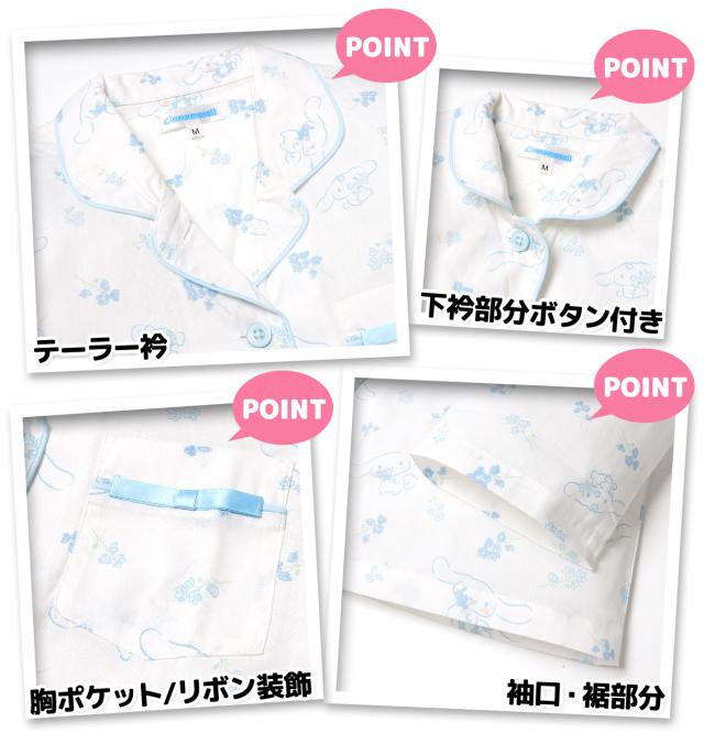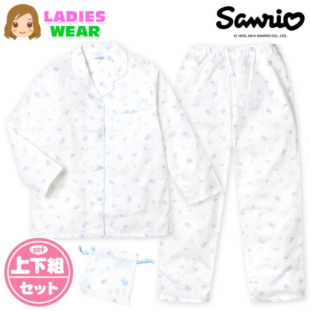【送料無料】婦人 レディース 綿100% 長袖 テーラー パジャマ Sanrio サンリオ シナモン 前開き ブロード生地 ミニ巾着付き M L yg-2357a-wt【メール便対応】