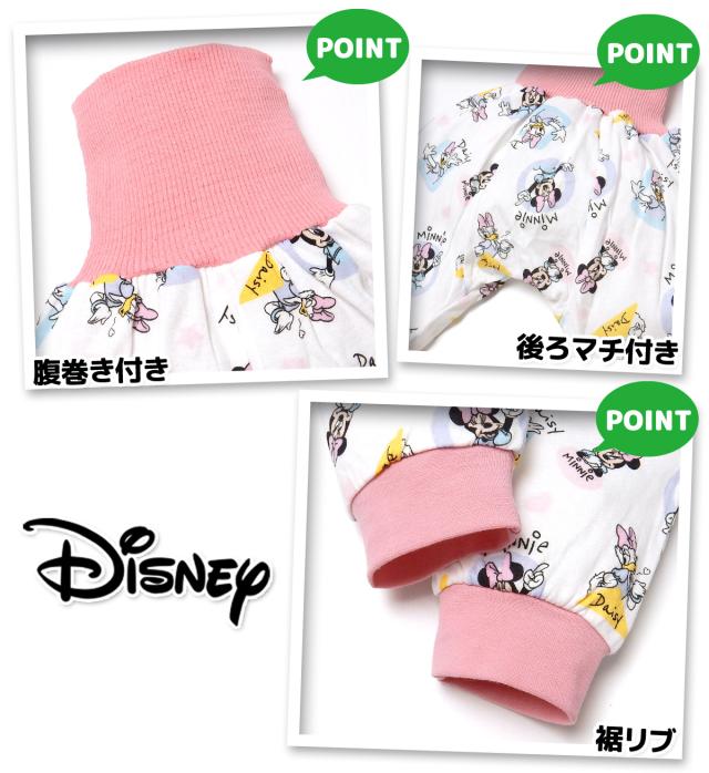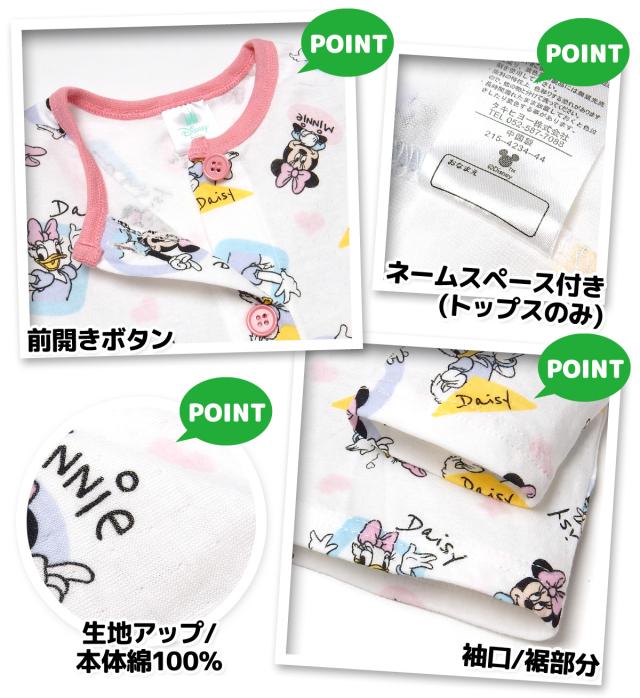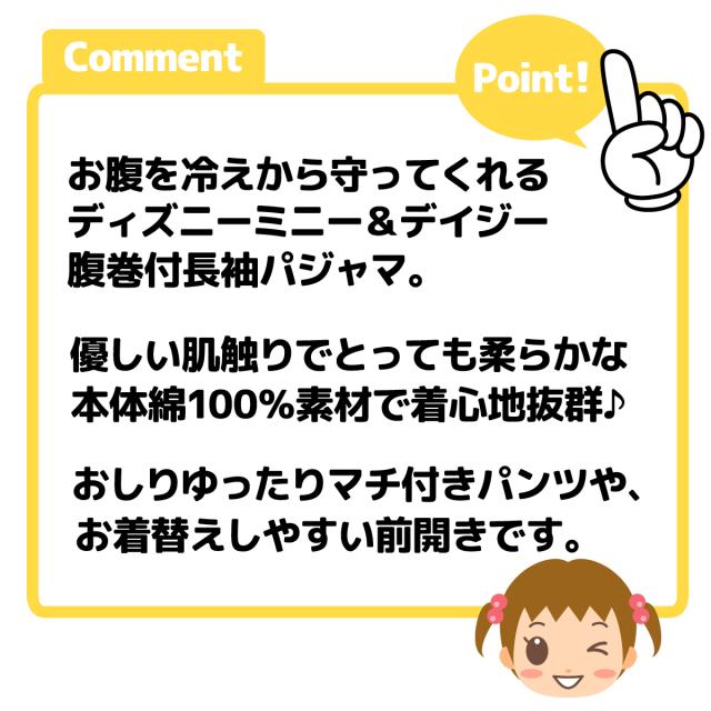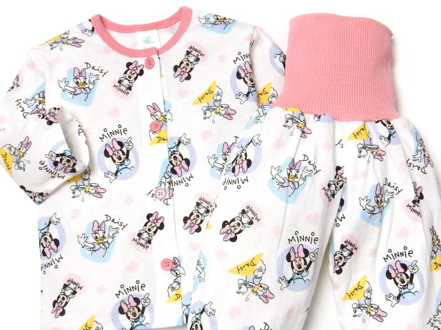 【送料無料】女児 ベビー 腹巻付き 長袖 パジャマ Disney ディズニー ミニー デイジー 前開き 上下組 本体綿100% おしりマチ ネームタグ 総柄 ベビー服 女の子 80cm 90cm 95cm iw-1162a-pk【メール便対応】