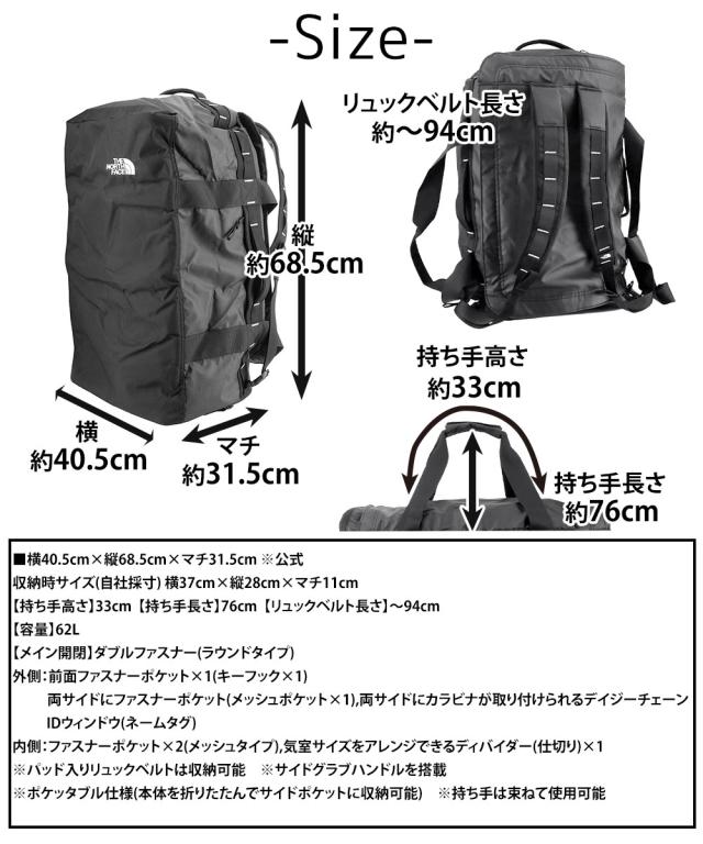 | サイズ(約) ※当店実寸値 | 公式サイズ 横40.5cm×縦68.5cm×マチ31.5cm 収納時サイズ(自社採寸) 横37cm×縦28cm×マチ11cm 【持ち手高さ】33cm 【持ち手長さ】76cm 【リュックベルト長さ】〜94cm 【容量】62L | ||