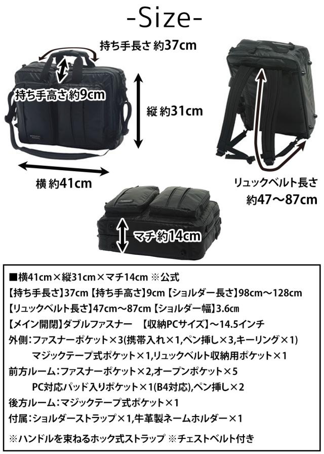 | 備考 | 【メイン開閉】ダブルファスナー 外側/ ファスナーポケットx3(うち1つは中に携帯入れx1、ペン挿しx3、1つは中にキーリングx1(取り外し可)) マジックテープ式ポケットx1 リュックベルト収納用ポケットx1 [前方ルーム] ファスナーポケットx2 オープンポケットx5 PC対応パッド入りポケットx1(B4対応) ペン挿しx2 [後方ルーム] マジックテープ式ポケットx1 付属/ ショルダーストラップx1 牛革製ネームホルダーx1 ※ハンドルを束ねるホック式ストラップ ※チェストベルト | ||