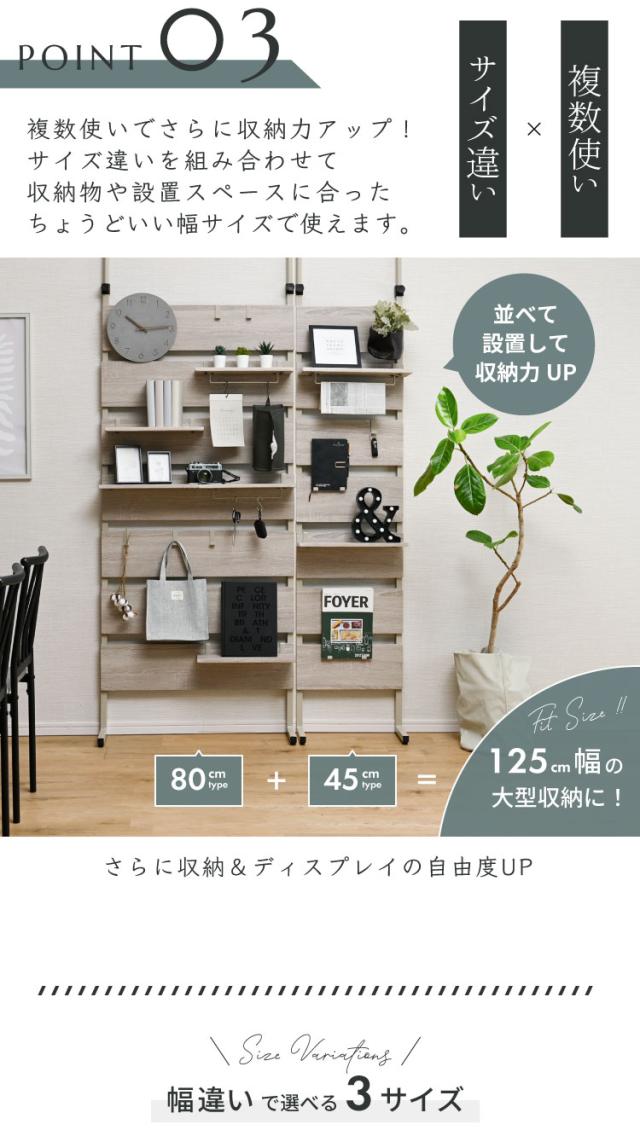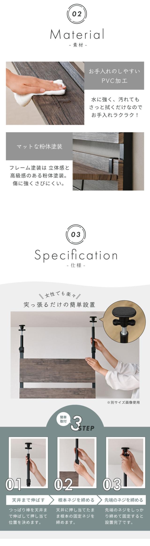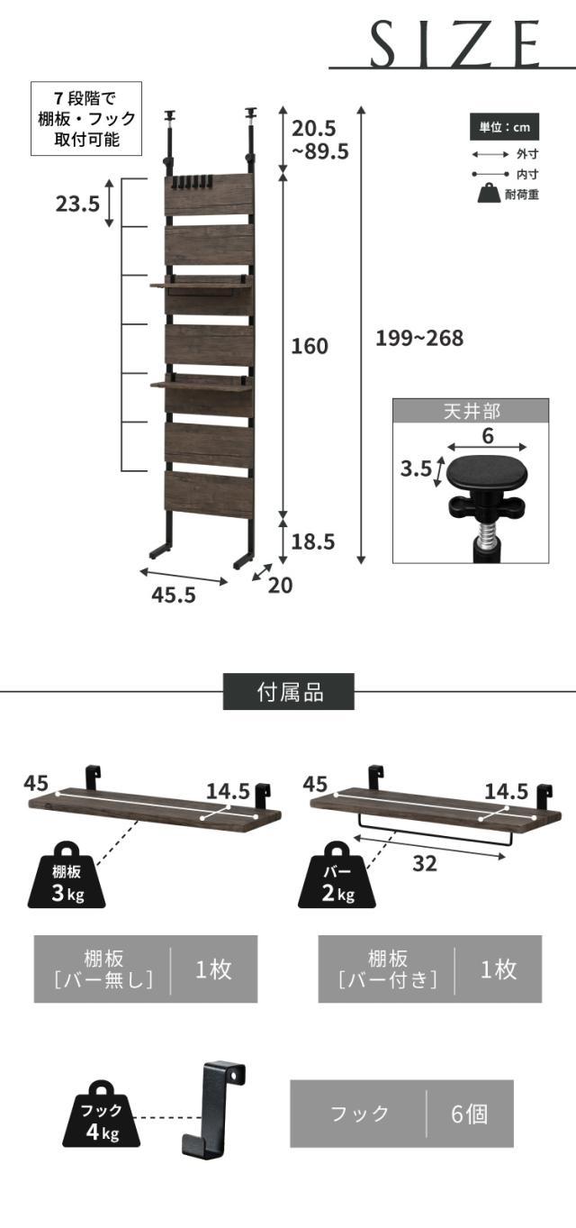 | サイズ | ・本体外寸: 幅約45(突っ張り接続部含む幅約45.5)×奥行約19.5(突っ張り接続部含む奥行約20)×高さ約199〜268cm |
