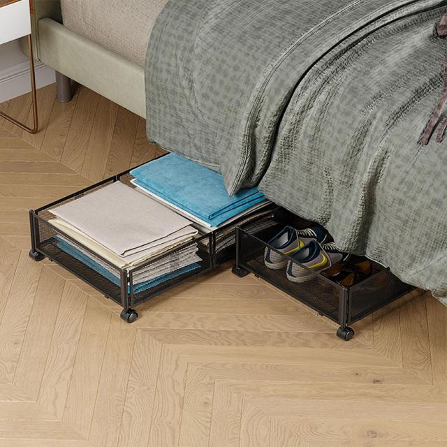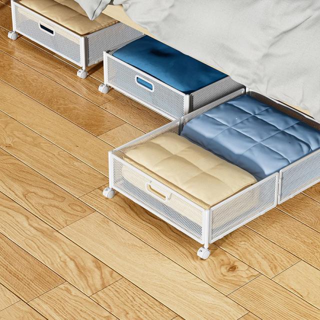 高さ約16cm(収納部分約11cm)の薄さですが、収納部は約41×58cmでたっぷり収納出来ます。また、360°回転のロック付きキャスターと持ち手が付いており、簡単にベッド下から引き出すことができます。