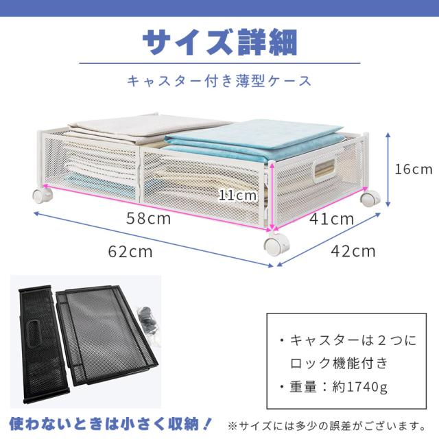 【簡単にたっぷり収納】高さ約16cm(収納部分約11cm)の薄さですが、収納部は約41×58cmでたっぷり収納出来ます。また、360°回転のロック付きキャスターと持ち手が付いており、簡単にベッド下から引き出すことができます。【金属製でしっかり】本などの重いものも、金属製でシッカリしており安心して収納できます。※過度に重いものは安全状お避け下さい。【誰でも簡単組み立て】組み立てはとっても簡単です。キャスターを差し込み、底板をはめ込めばすぐに使えます。【製品】サイズ約62x42x16cm(キャスター含む)約58x41x11cm(収納部)重さ:約1740g