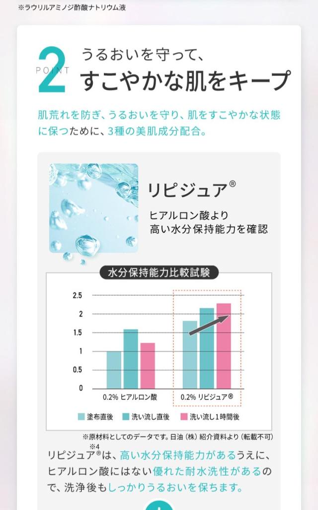 ●保湿成分リピジュア(R)※4と、ヒト型セラミド※5を配合。お肌のうるおいを守って、乾燥させずにしっとり洗い上げます。