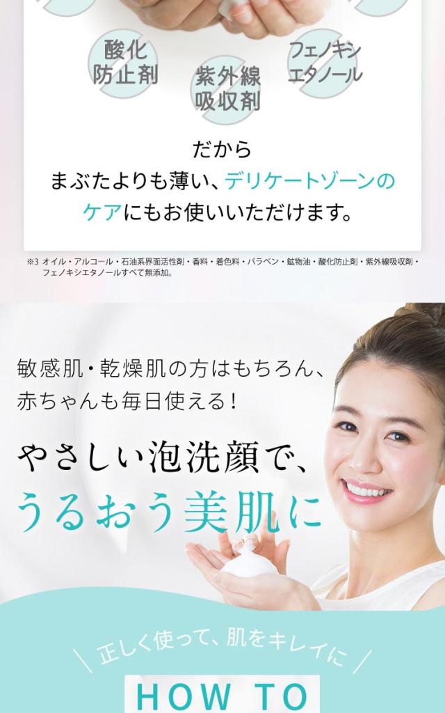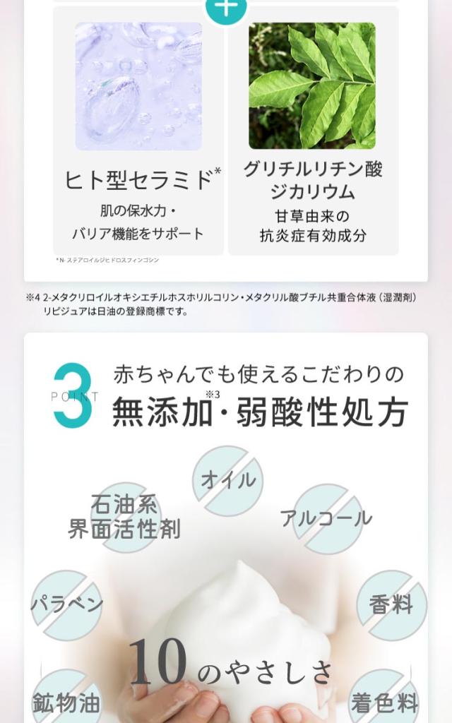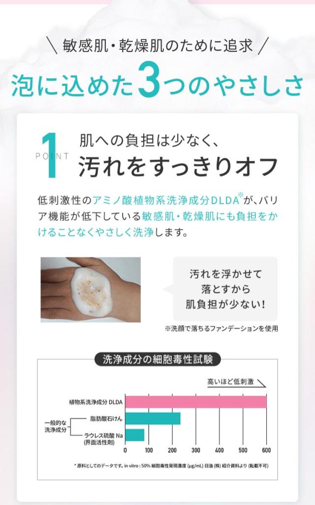 ●お肌へのいたわりにこだわった無添加※2・アレルギーテスト済み※3の、使いやすい泡タイプの低刺激性※3・高保湿洗浄料です。
