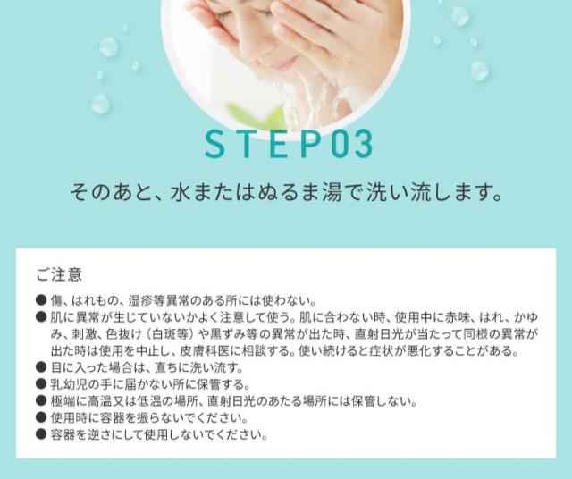 ・適量を手に取り、マッサージするようにやさしく洗い、その後よく洗い流してください。
