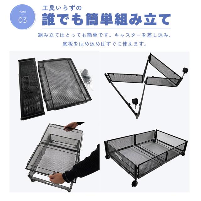 【簡単にたっぷり収納】高さ約16cm(収納部分約11cm)の薄さですが、収納部は約41×58cmでたっぷり収納出来ます。また、360°回転のロック付きキャスターと持ち手が付いており、簡単にベッド下から引き出すことができます。【金属製でしっかり】本などの重いものも、金属製でシッカリしており安心して収納できます。※過度に重いものは安全状お避け下さい。【誰でも簡単組み立て】組み立てはとっても簡単です。キャスターを差し込み、底板をはめ込めばすぐに使えます。【製品】サイズ約62x42x16cm(キャスター含む)約58x41x11cm(収納部)重さ:約1740g