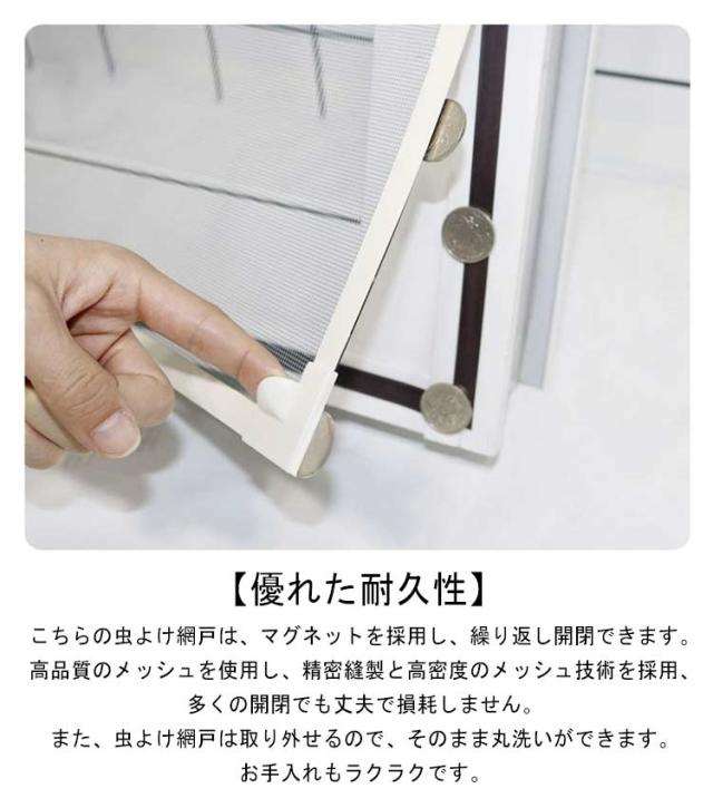 | 【防虫・防蚊】こちらの虫除け網戸は、高密度メッシュで微細な虫・蚊の侵入も防ぎます。隙間もなく全面覆う窓用網戸タイプなので、虫除け網戸を窓枠に設置しておくと、窓を閉めなくても、虫や蚊などの侵入を気にせず、空気の通しが良くできます。 【カット可能・サイズ調節可能】この防虫ネットは、カットによるサイズ調節が可能です。お宅の窓大きさに完璧に合わせて防虫ネットをカットできます。だから、この防虫ネットはどんな窓枠にも網戸がぴったりと納まります。この防虫ネットキットがあれば、網戸を作るお手間もお金も節約します。 【通風性】この蚊よけ網戸の開口率が高く風通しも優れています。十分な風通しも得ることができます。夏には、エアコンを使わずに本品を取り付けることによって、空気の入れ替えが出来、風通しが良くなり涼しく暮らすことができます。 【優れた耐久性】こちらの虫よけ網戸は、マグネットを採用し、繰り返し開閉できます。高品質のメッシュを使用し、精密縫製と高密度のメッシュ技術を採用、多くの開閉でも丈夫で損耗しません。また、虫よけ網戸は取り外せるので、そのまま丸洗いができます。お手入れもラクラクです。 | |