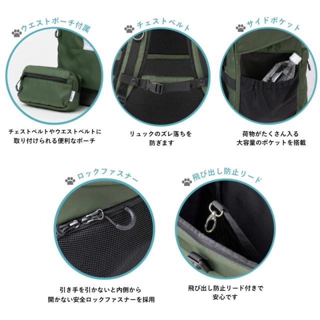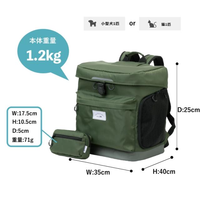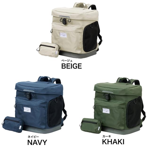 | SPEC | 本体:35×25×40 cm ポーチ: 10.5×17.5×5cm 重量:1.2kg ポーチ: 71g 推奨体重 :5kgまで 耐重量 :10kg 付属品 :ウエストポーチ 材質:表面生地:ポリエステル(ベージュ、ネイビー)、ナイロン(カーキ) 内装・底生地:ポリエステル メッシュ:PVC リード固定具:PP+ポリエステル カラー:ベージュ・カーキ・ネイビー |