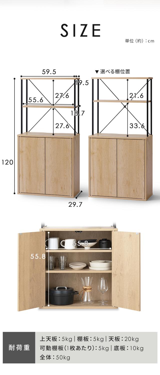 上天板:約5kg、棚板:約5kg、可動棚板(1枚当たり):約5kg、天板:約20kg、底板:約10kg、全体:約50kg
