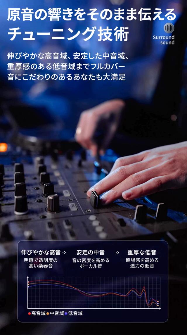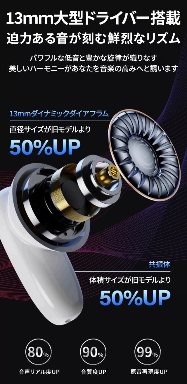 13mmの大口径ドライバーユニット搭載で、迫力ある重低音が刻む鮮烈なリズム、広さと奥行のある四方を包みこむ、パワフル立体サウンドを実現