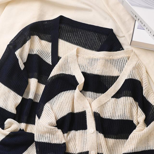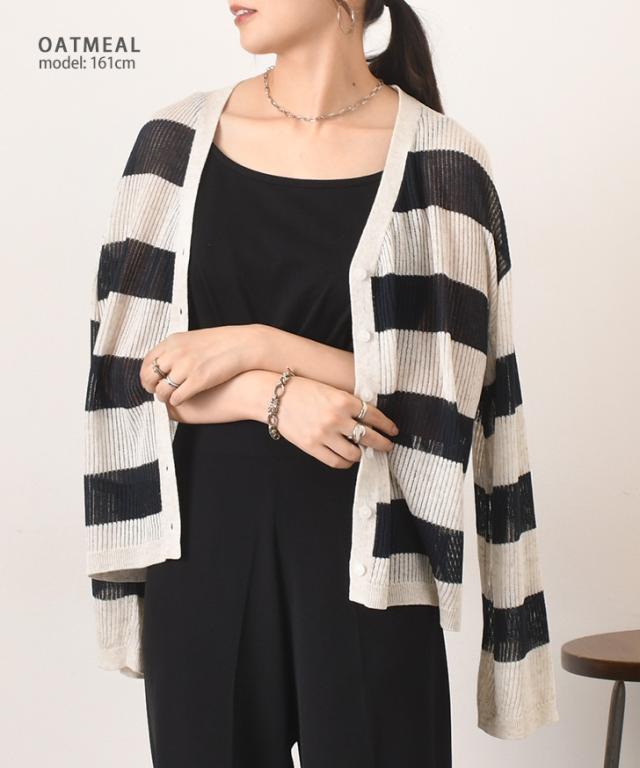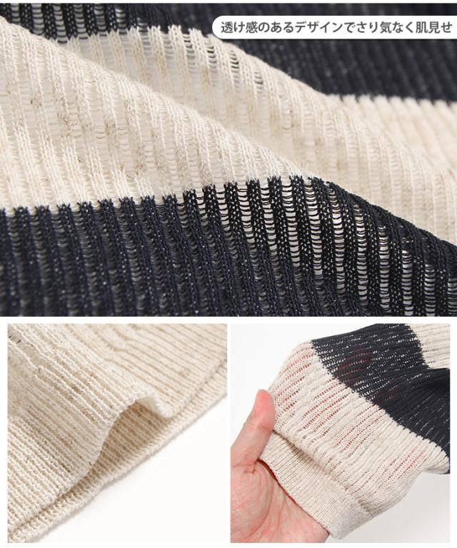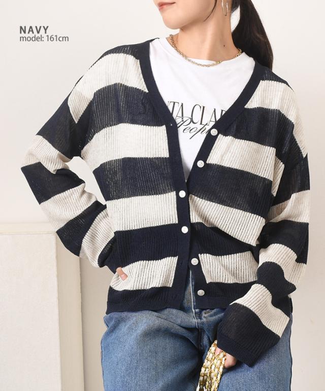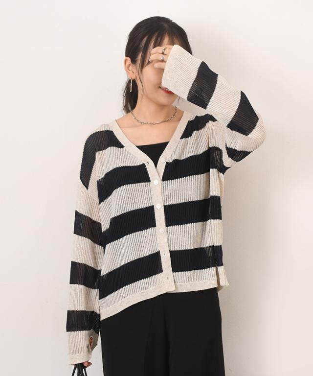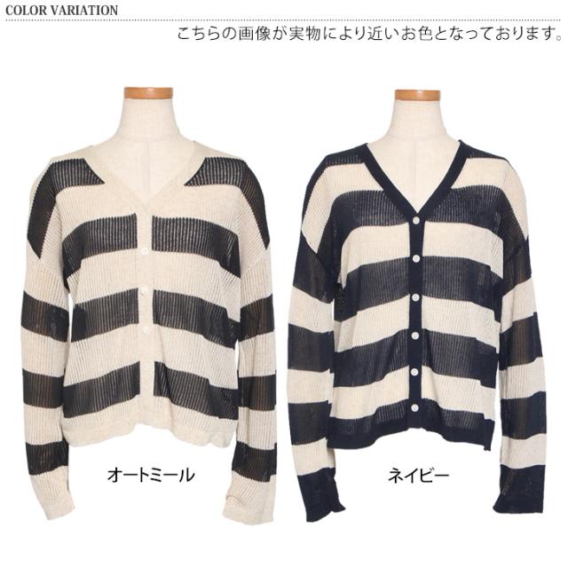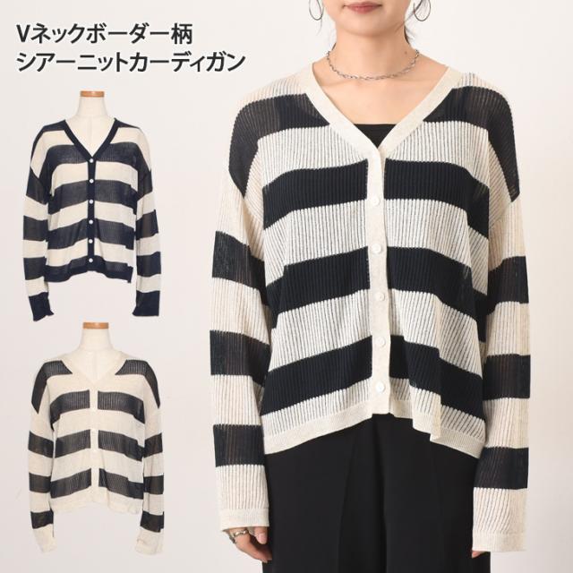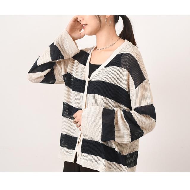 新作 Vネックボーダー柄シアーニットカーディガン レディース 夏 秋 トップス 羽織り 上着 薄手 透け感 おしゃれ 可愛い きれいめ カジュアル シンプル 透かし編み 通勤 通学 冷房対策 ゆったり リブ 前開き