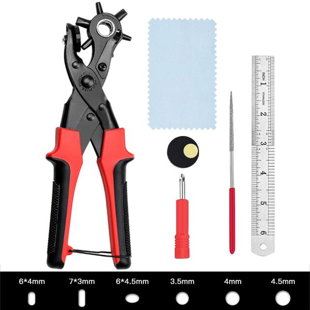 ・転回式設計ベルトパンチ レザーパンチは6段階式転回が設計されますが、矢印方向にダイヤルを回転し、場合により穴の大きさを選んで、穴を開けます。穴寸法が6種類があります。1つの楕円型穴6*4.5mm、2つの細長型穴6*4mm、7*3mmと3つの丸型穴3.5mm、4mm、4.5mm です。