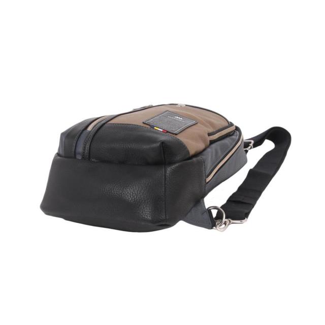 3色のフェイクレザーを組み合わせた高級感のあるデザインが印象的。コンパクトな見た目ながらお出かけに必要な荷物がすべて入るサイズ感。前面にファスナー仕様のポケットを完備。両手が空くのでイベントや旅行におすすめのアイテムです。