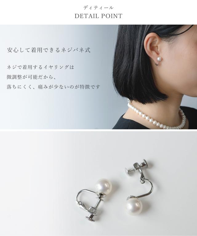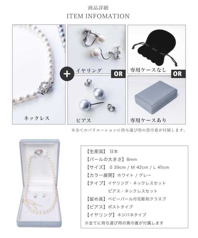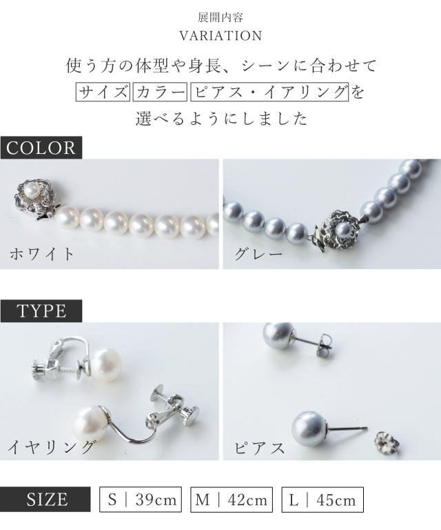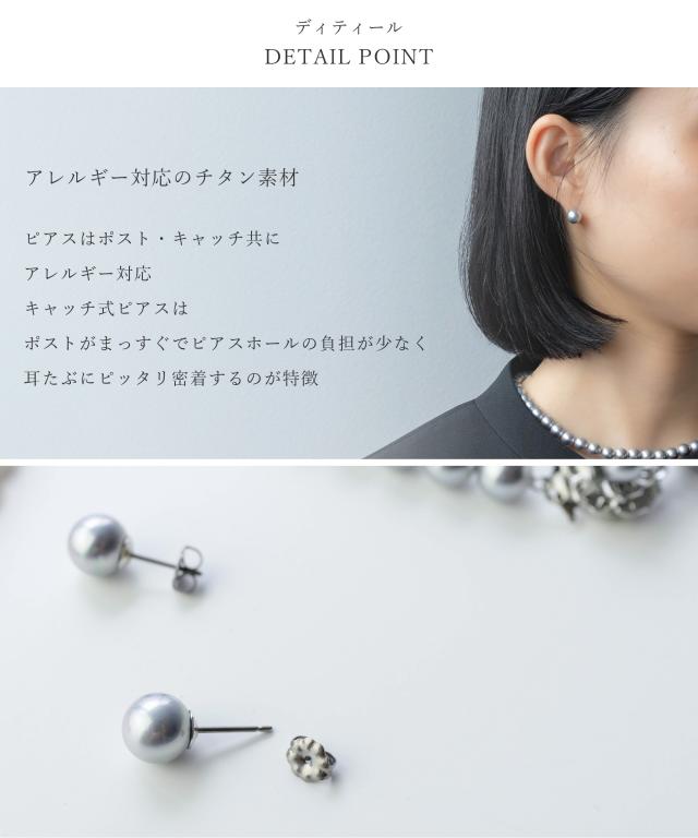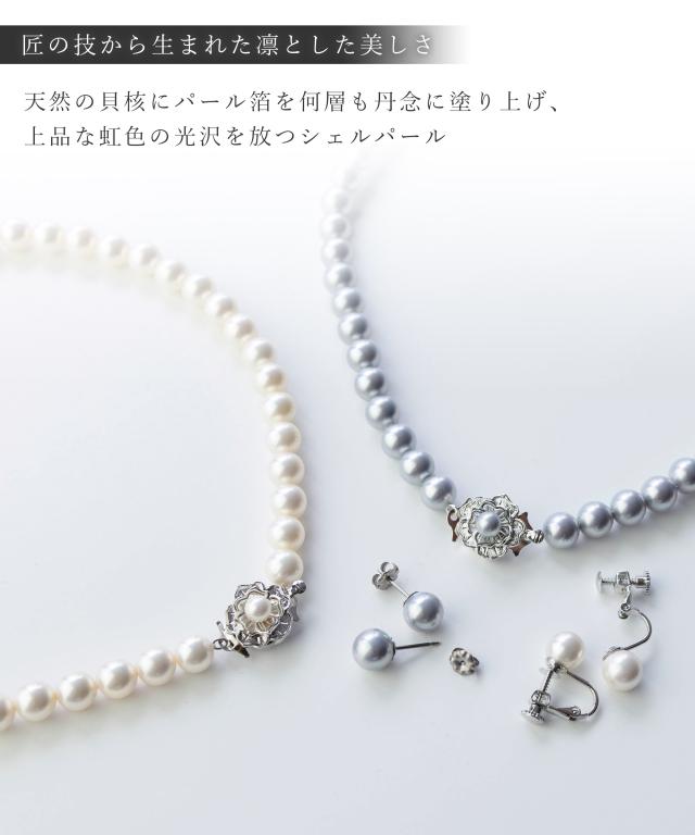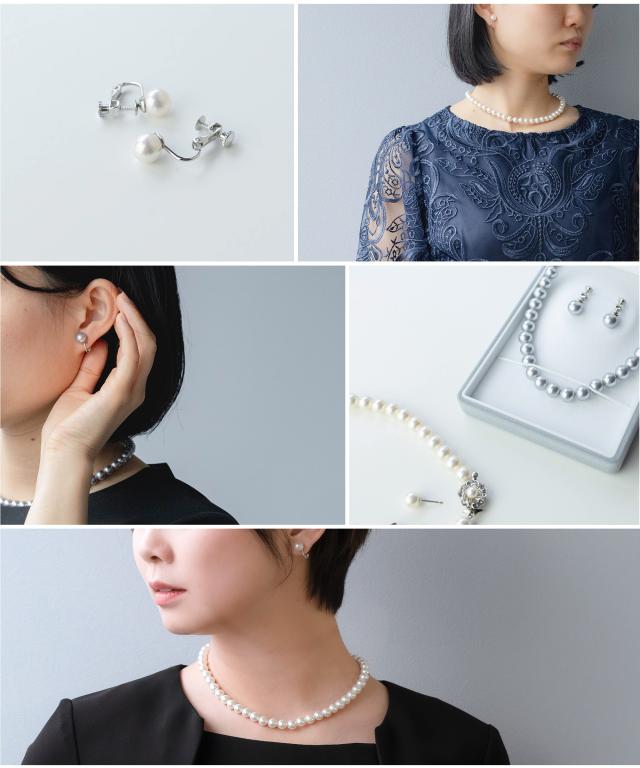 天然の貝の核にパール箔を何層も丹念に塗り上げ上品な虹色の光沢を放つシェルパール 大正から100年超えて続く老舗企業が作る、人造真珠の最高級品 8.0mmのパール径は着用する人を選ばない一般的なパールネックレスの大きさ 身長や首の太さによって選べるように、39cm 42cm 45cm の3サイズを用意しました 結婚式や卒業、卒園、入学入園、お宮参り、七五三などのセレモニーやお呼ばれには白を、 落ち着いた印象のグレーは30代以降の葬儀やお通夜などの弔事などにおすすめ 背中も抜かりなく、5mmのベビーパールと花の彫刻が美しいデザイン 美しいデザインを作ってくれるクラスプを採用しました イヤリングはネジバネ式 微調整が可能なイヤリングは、落ちにくく、ちょうどいい強さでお使いいただけるので痛みが少ないのが特徴です ピアスはキャッチ式 ポストがまっすぐでピアスホールへの負担が少なく、耳たぶにピッタリ密着するのが特徴 ポスト・キャッチ共に嬉しいアレルギー対応のチタン素材を使用しました |