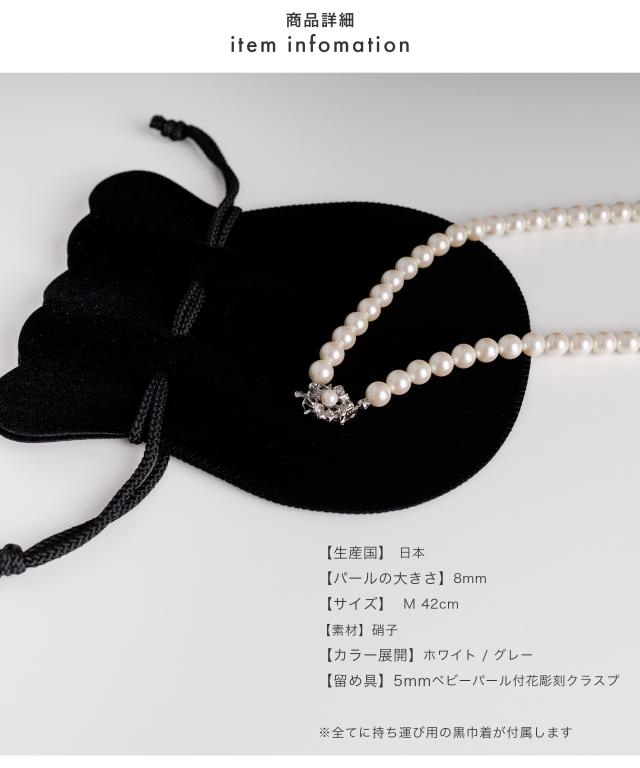 硝子玉を核としパール箔を何層にも丹念に塗り上げ上品な輝きを放つ8mm玉フォーマルネックレス 人造真珠の全国シェア80%を占める大阪和泉市で作られるいずみパール 大正から100年超えて続く老舗企業が作る日本製のパールネックレス ガラスのイミテーションパールは程よい重さと何層にも塗られたパール層が高級感のあるネックレス 結婚式などのお呼ばれシーンから、お葬式・通夜などの弔事、入園入学、卒園卒業、お宮参り、七五三などのセレモニーまで、 あらゆるハレの日に対応できるレディースアクセサリー ホワイト:全てのフォーマルシーンに加え、デイリーにも使えるホワイトパール グレー:弔事におすすめ、通夜や葬儀が増えてくる30代以降は一本持っていると安心できる落ち着いた印象のネックレス 後ろ姿も抜かりなく、5mmベビーパールと花の彫刻が美しいクラスプ 美しさを優先するために、留め具はデザイン性の高いスライド式を採用 パールネックレスには持ち運び用の黒巾着が付属 長く美しい状態を保つため、着用後は金具とパールを乾いた布で優しく拭いてから保管をしてください |