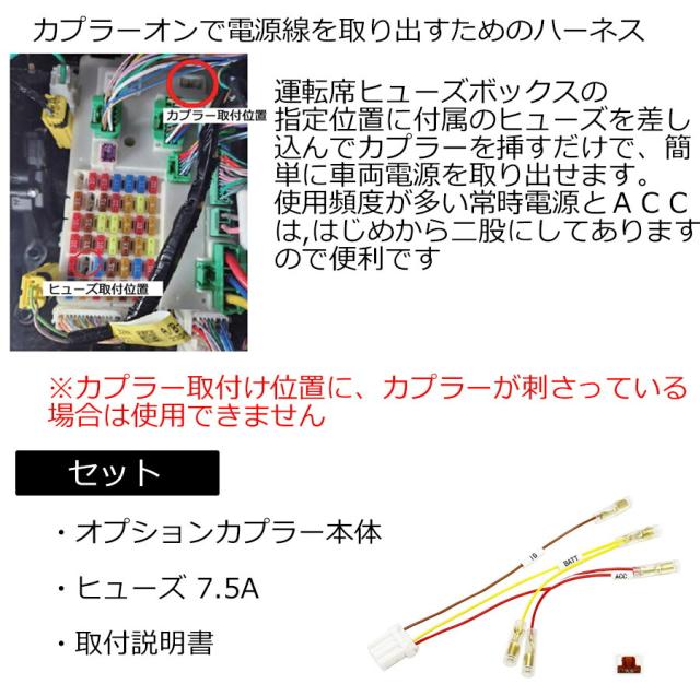 ![]() 電源を、どなたでも簡単に取り出せる電源取り出しカプラーです。 ヒューズボックスからIG電源、常時電源、ACC、の電源取り出し(通常デッキ裏や、ヒューズから電源をとります)が、このカプラーをヒューズボックスのカプラーに挿し付属のヒューズを差し込むだけで電源を取り出せます。 電源を取るのにデッキを外す必要もありませんし、検電テスターを当てて電源を探す必要もありません。 電装品の取付には欠かせない一品です。 後々の配線の接続を考えまして、ワンタッチのギボシを取り付けてありますので配線接続も楽チン♪です。 使い方は無限大!!ETCの取り付けやドライブレコーダー・レーダーの電源取りなどに大活躍です 商品詳細 内容物 ・オプションカプラー本体 ・ヒューズ 7.5A ・取り付けマニュアル 作業時間目安・・・約5〜10分 ☆取得可能電源☆ 常時電源・・・常に電源(バッテリー電圧)を示します。 IG電源(イグニッション電源)・・・イグニッションONの状態でバッテリー電圧を示します。 ACC・・・キーを1回、回した時にバッテリー電圧を示します。 |