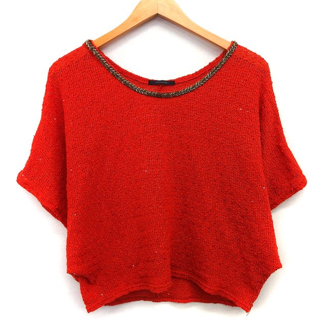 【中古】ドスチ DOSCH かぎ針編み ニット セーター ショート丈 ビーズ装飾 スパンコール 五分袖 丸首 M オレンジ