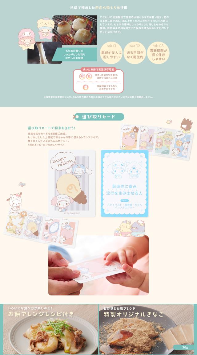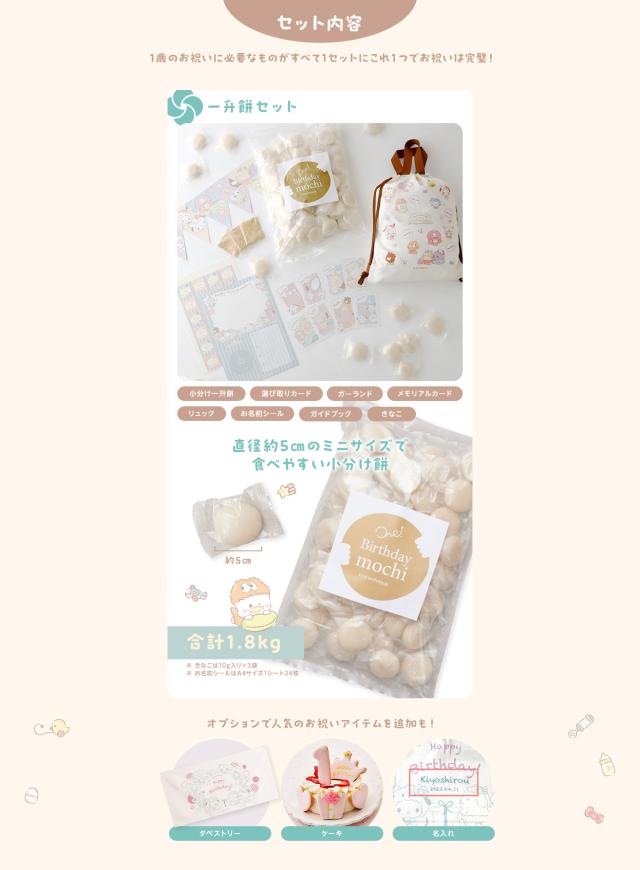 | セット内容 | ●小分け餅(33g)×約55個 ●選び取りカード(1袋8枚入) ●お名前シール(1シート24片) ●メモリアルカード×1 ●リュック×1 ●ガーランド×1 ●砂糖入りきなこ(10g)×3 ●ガイドブック×1 |
