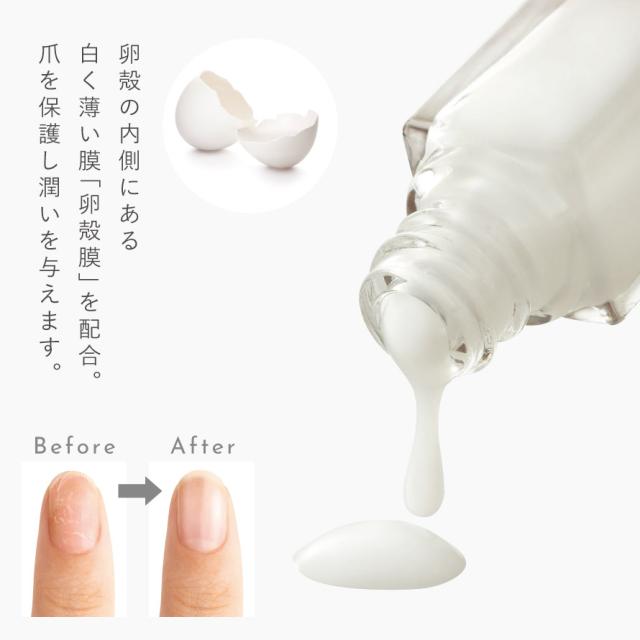 卵殻の内側にある白く薄い膜「卵殻膜」を配合。うるっと艶めく美爪へサポートします。