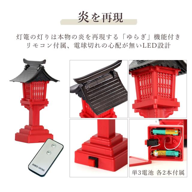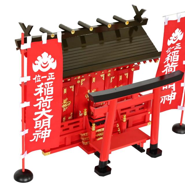深紅の稲荷宮 特上塗り 通し屋根 三社 二対のお狐様 大鳥居 朱色灯ろう 神棚セット 稲荷紋 神具セット 灯篭 燈篭