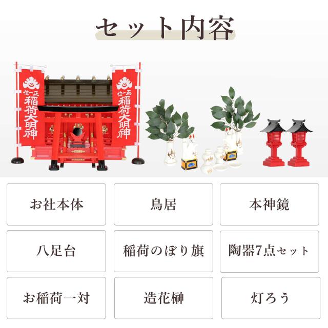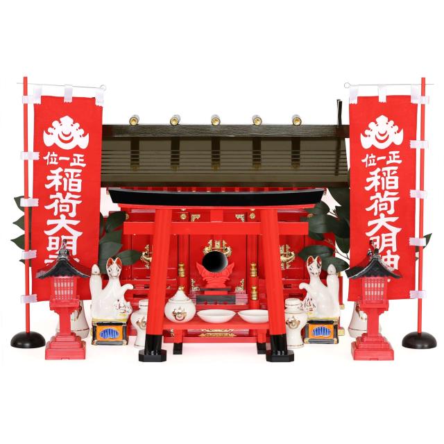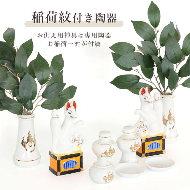 神具は稲荷紋付きの専用陶器が付属、八足台と神鏡台も稲荷宮専用カラーとなっています。陶器お稲荷様は上品で荘厳な「瀬戸焼稲荷」一対。朱色の灯ろうはほんのりと明かりを落とし、目を引く大き目の稲荷のぼり旗と合わせ、とても豪華な稲荷神社となっています。