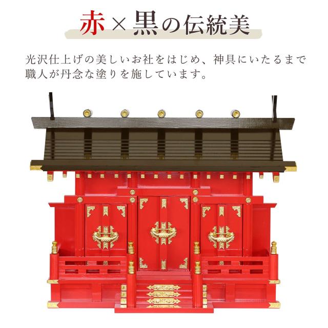 丹念な塗りを施した、光沢仕上げの美しいお社、お稲荷様をお祀りする専用セット。たくさんのお神札を収納できる、当店オリジナルの「三社・通し屋根」タイプです。職人手作業で組み上げられる純国産、丁寧な重ね塗りは見とれるほどの「朱」。お稲荷様を神々しくお祀りいたします。