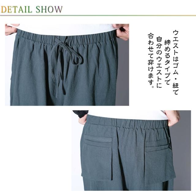 | シンプルだけど個性的、ラフな緩さがクセになるサルエルパンツ。 爽やかな季節感のある綿麻混の素材は夏でも快適に♪快適な穿き心地を実現しています。 ワイドな形ながら裾を絞り、ドレープを作りながらバルーンのような丸みのあるシルエットを作ります。 足首が見える絶妙な丈で見ためも涼しい!太もも部分にたっぷりと余裕があり涼しい穿き心地です。 ウエストはゴム・紐で締めるタイプで自分のウエストに合わせて穿けます。 お出かけに部屋着、普段着、旅行用、お洒落着にとして大活躍する! | |