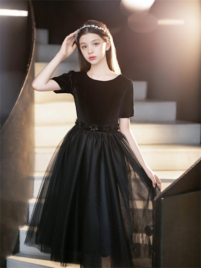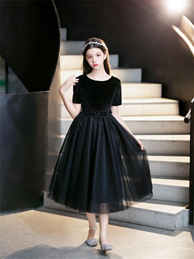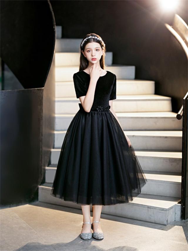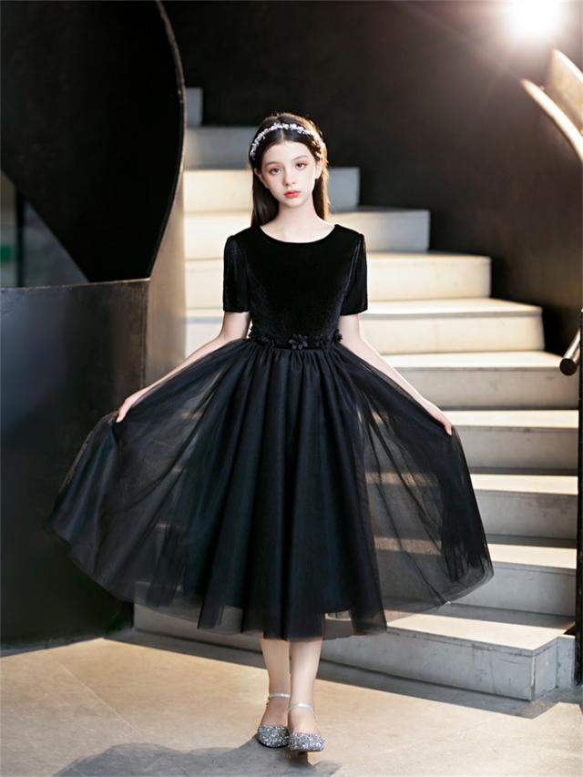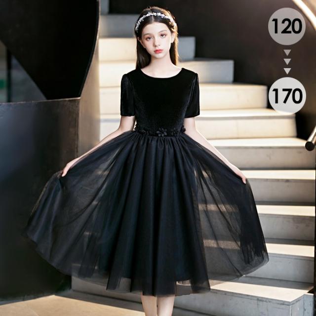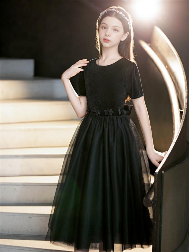 ピアノ発表会 ドレス 子供 女の子 発表会 ドレス 子ども ワンピース ブラック 黒 半袖 お祝い日 演奏会 音楽会 フォーマル 誕生日 撮影 パーティー ブラックドレス ジュニア キッズ ミモレドレス ミモレ丈 中学生 高校生 可愛い 七五三 結婚式 卒業式 入学式 d1359d7d7lc