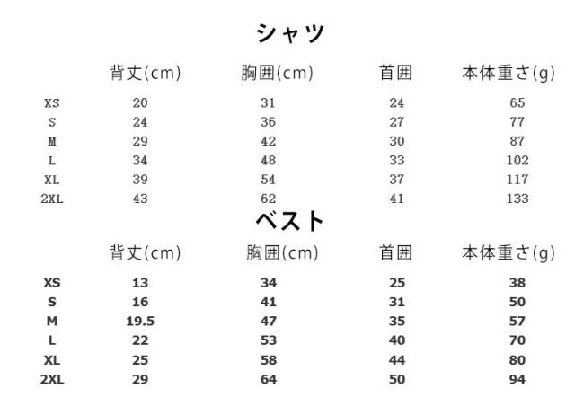 | サイズについての説明 | 【セット内容】:ベスト、シャツ2点セット(蝶ネクタイは付属しません) ※上記サイズは平置き実寸になります。 サイズ表の実寸法は商品によって1-3cm程度の誤差がある場合がございます。 ※ワンちゃんのヌードサイズよりもゆとりをもってお選びください。 |