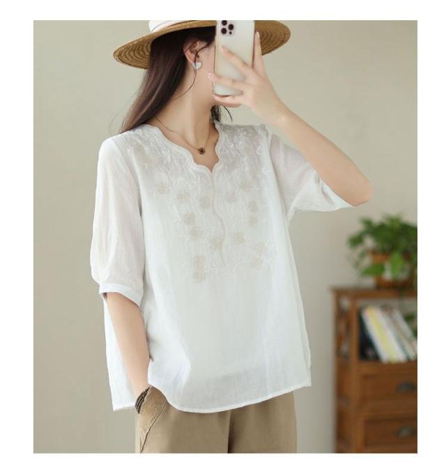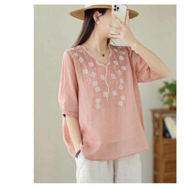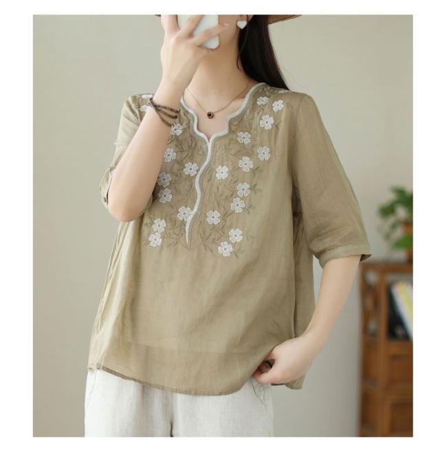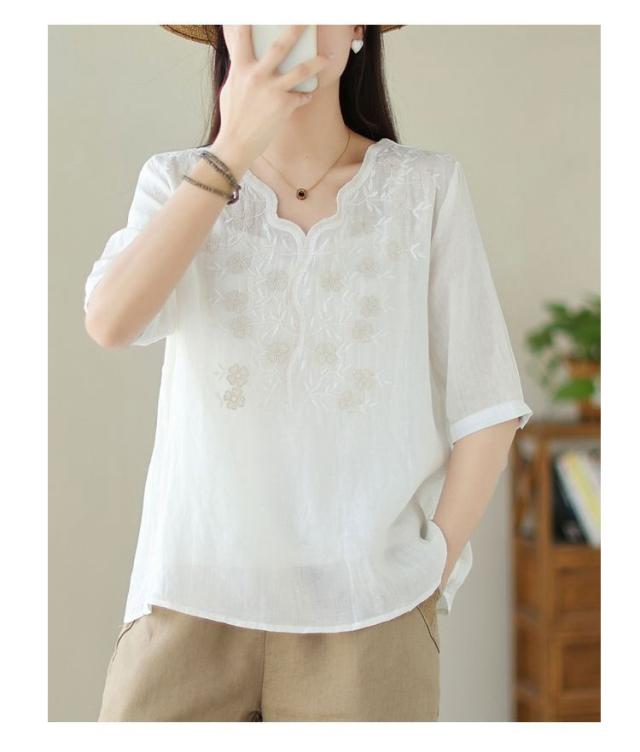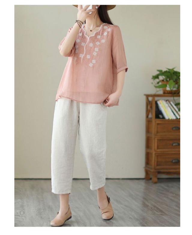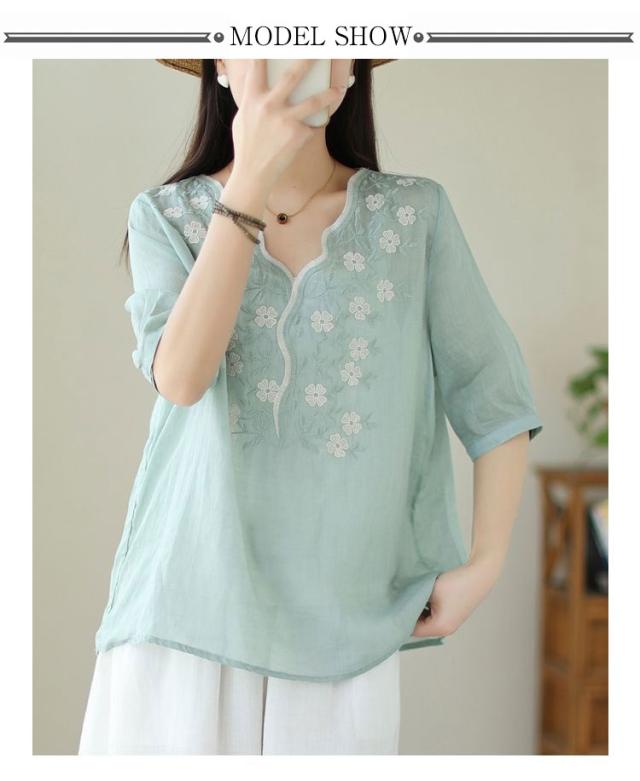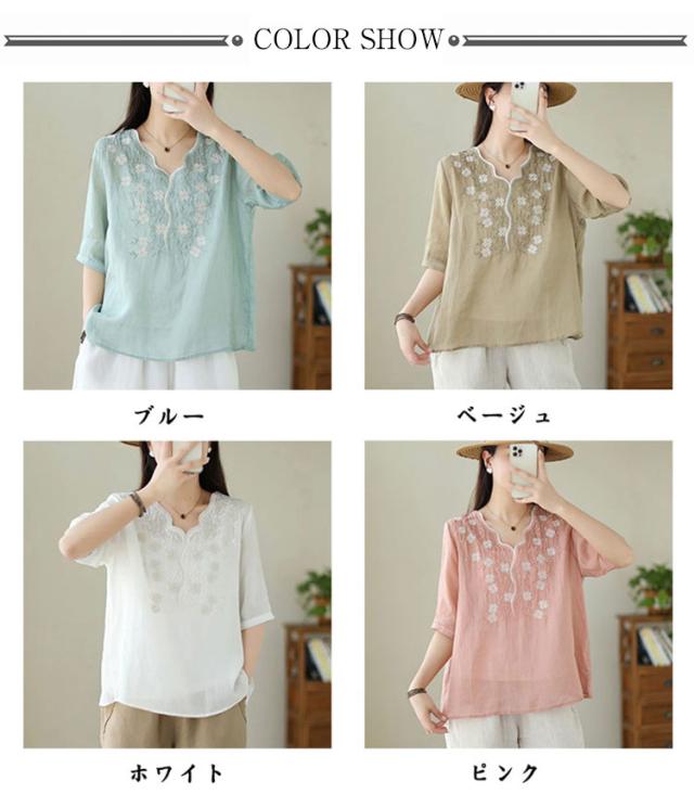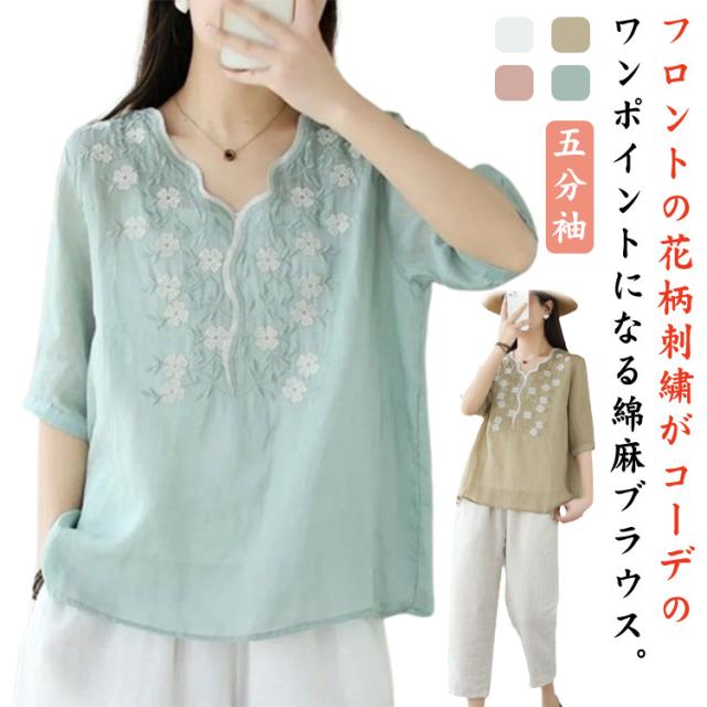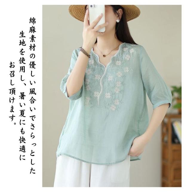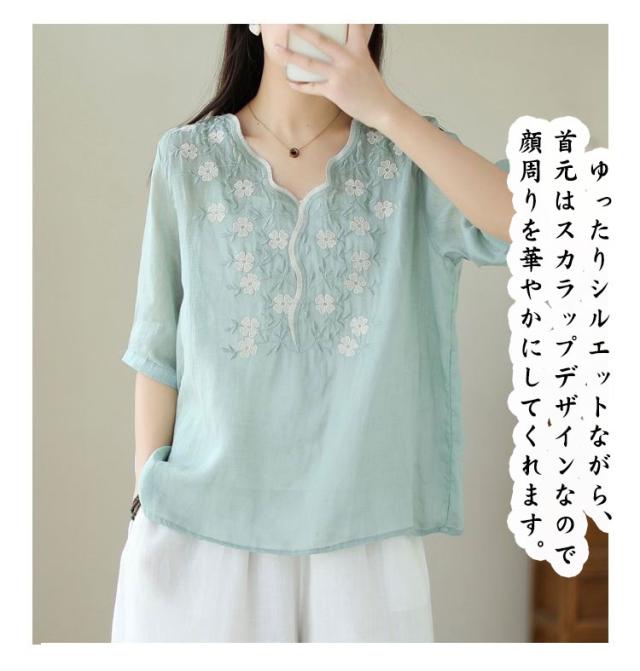 大人 花柄 シャツブラウス リネン混 春夏秋 半袖 スカラップ tシャツ レディース 刺繍 トップス ブラウス Vネック プルオーバー 綿麻 綿麻 可愛い 大きいサイズ ゆったり 体型カバー きれいめ カジュアル きれいめ おしゃれ お出かけ
