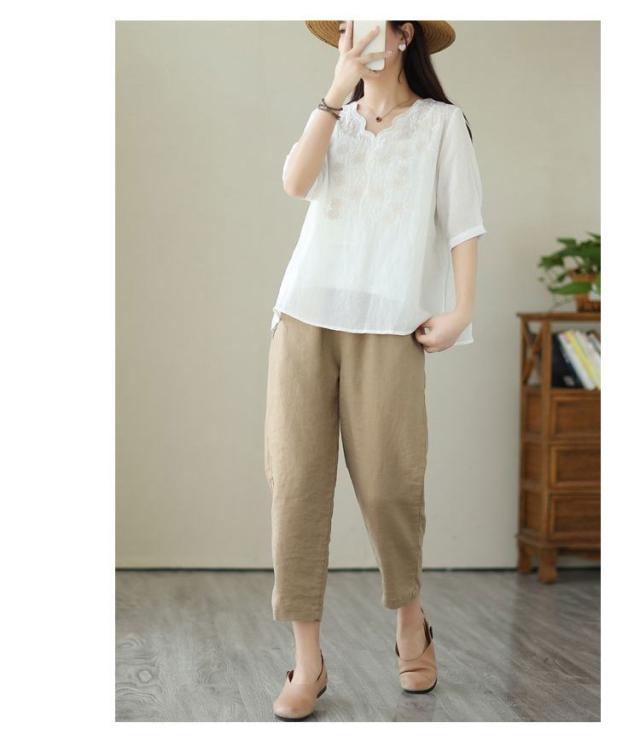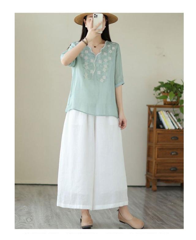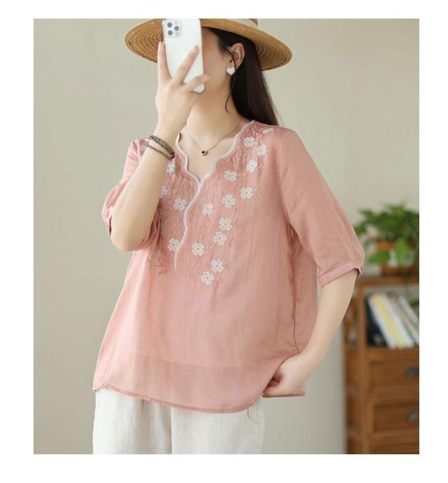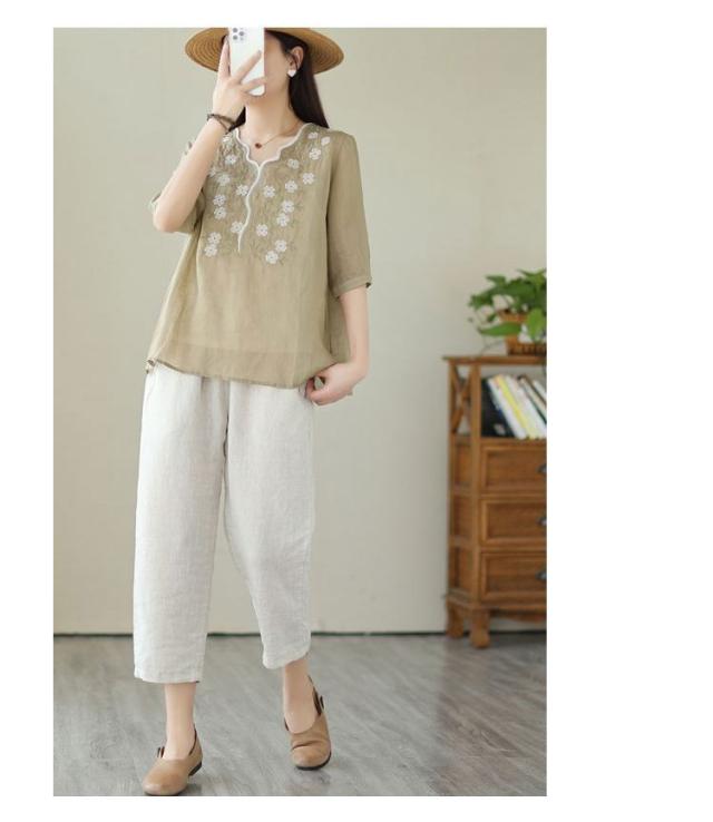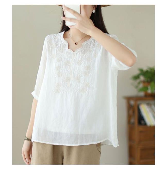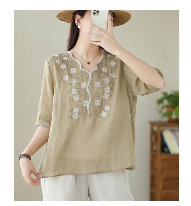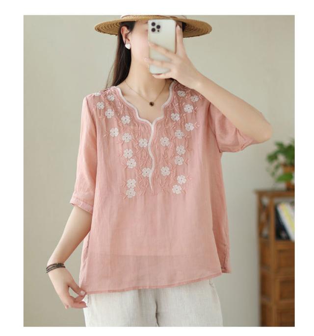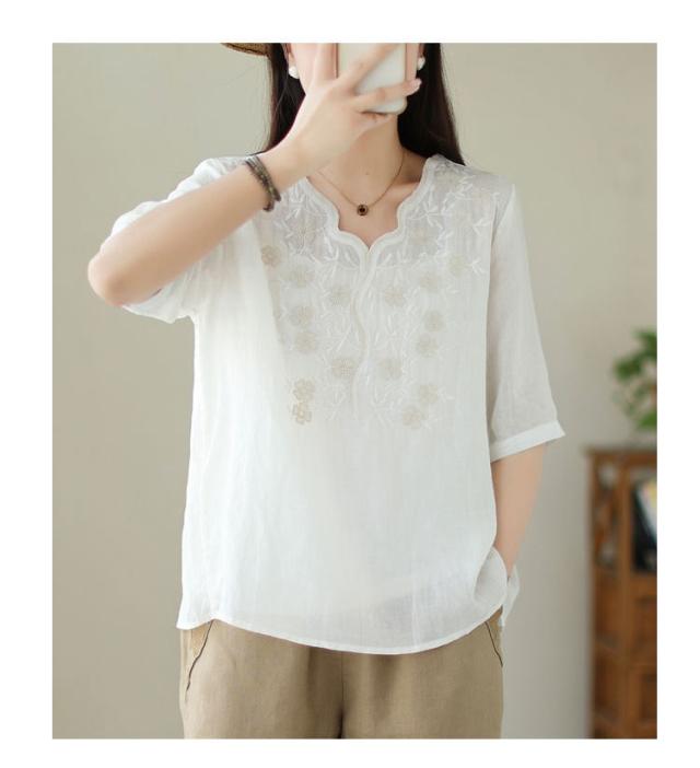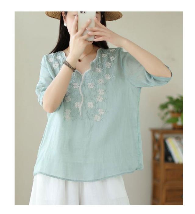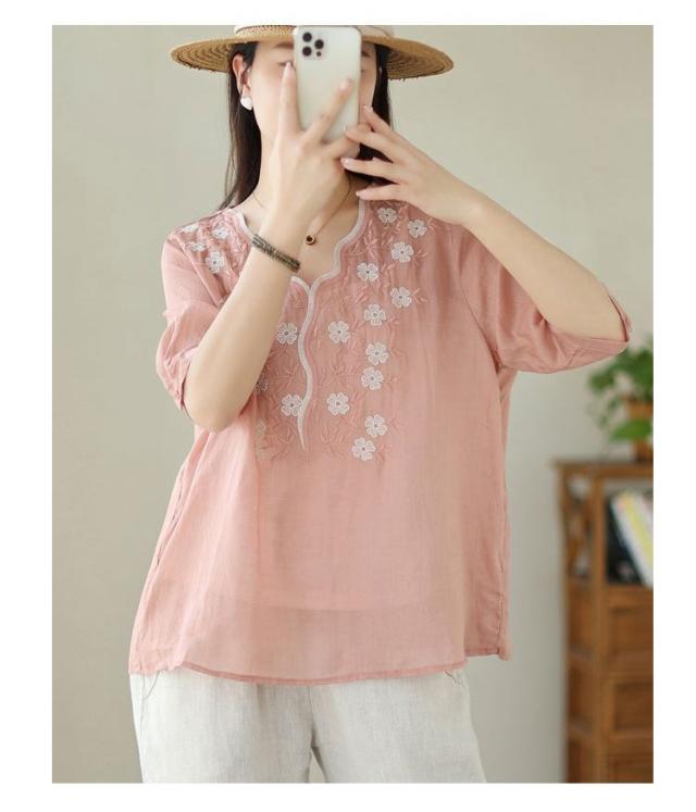 大人 花柄 シャツブラウス リネン混 春夏秋 半袖 スカラップ tシャツ レディース 刺繍 トップス ブラウス Vネック プルオーバー 綿麻 綿麻 可愛い 大きいサイズ ゆったり 体型カバー きれいめ カジュアル きれいめ おしゃれ お出かけ