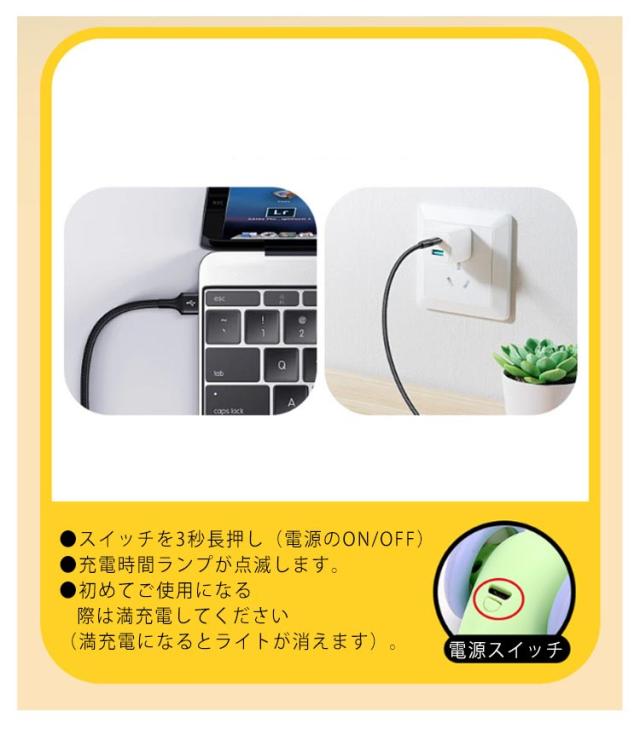 | サイズについての説明 | 【付属品】充電ケーブル*1 ※付属のUSBケーブルで充電し、約1時間の充電で約40‐120分時間を作動できます。 ※商品のサイズは手作業で測定させて頂いておりますので、若干の誤差があります。 |