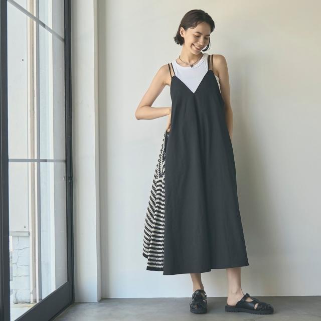 裾にかけて緩やかに広がるAラインと、ほんのりスッキリ見えする裾が盛夏から秋口へのシーズンにマッチ。
