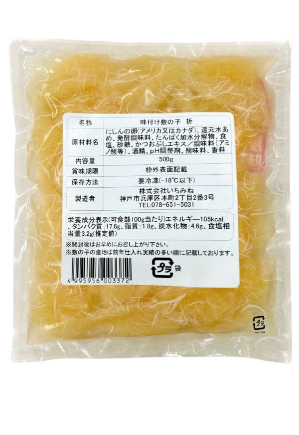 【原材料名】ニシンの卵、還元水あめ、発酵調味料、たんぱく加水分解物、砂糖、かつおぶしエキス、食塩/調味料(アミノ酸等)、酒精、pH調整剤、酸味料、香料