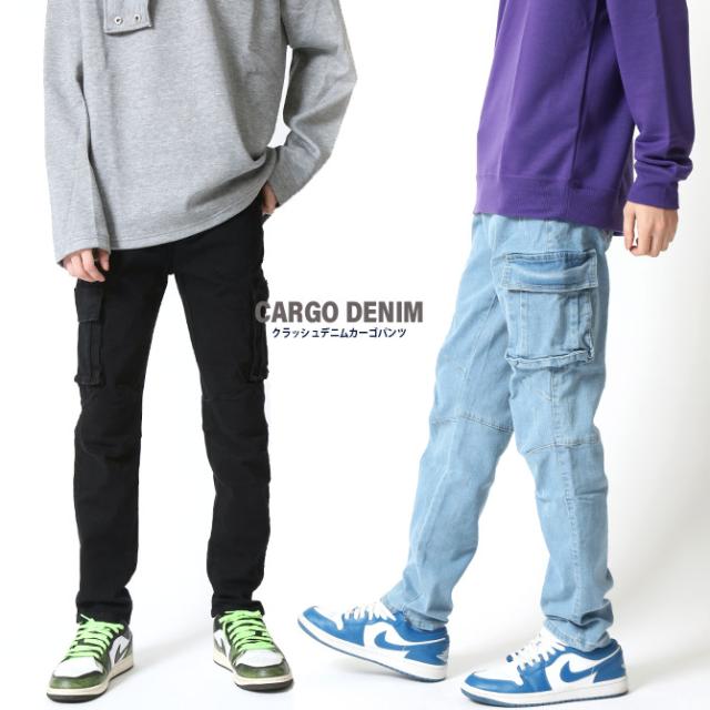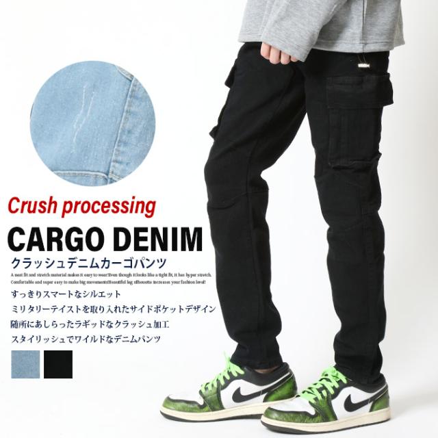デニムパンツ メンズ 新作 デニムカーゴパンツ クラッシュダメージ加工 ニーライン スリムシルエット メンズジーンズ