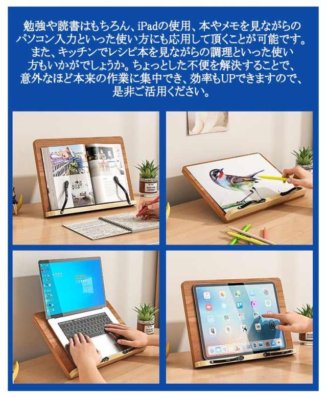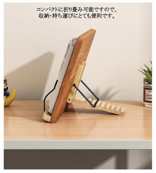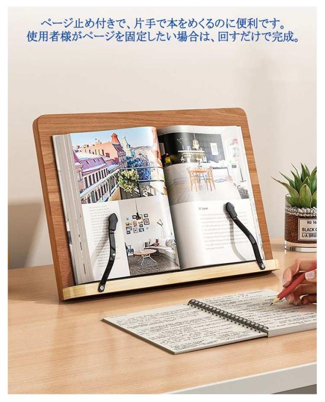 | 8段階角度調整、ページクリップ付き木製ブックスタンド。 8段階角度調整可能、人体工学の設計によって、より良い座姿から近視猫背などの問題を脱することができます。もっと快適に読書を楽しむことができます コンパクトに折り畳み可能ですので、収納・持ち運びにとても便利です。 勉強や読書はもちろん、iPadの使用、本やメモを見ながらのパソコン入力といった使い方にも応用して頂くことが可能です。また、キッチンでレシピ本を見ながらの調理といった使い方もいかがでしょうか。ちょっとした不便を解決することで、意外なほど本来の作業に集中でき、効率もUPできますので、是非ご活用ください。 ページ止め付きで、片手で本をめくるのに便利です。使用者様がページを固定したい場合は、回すだけで完成。 | |