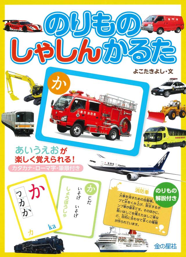 でんしゃ、ひこうき、ショベルカー…子どもたちが大好きなのりものが大集合!ひらがな・カタカナ・ローマ字・筆順付きで、はじめてのあいうえお学習にもぴったり。乗り物の解説付きなので、かるた遊びをしながら乗り物博士に!
