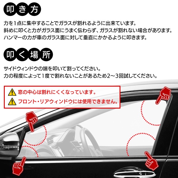 | ※本来の目的、用途以外には使用しないでください。 ※お子様やペットの手の届かない所で使用、保管して下さい。 ※刃物の取扱いには十分注意してください。 ※ガラス割りハンマーはサイドガラス専用です。 フロントガラス・リアガラス等の 合わせガラスは破砕出来ません。 | |