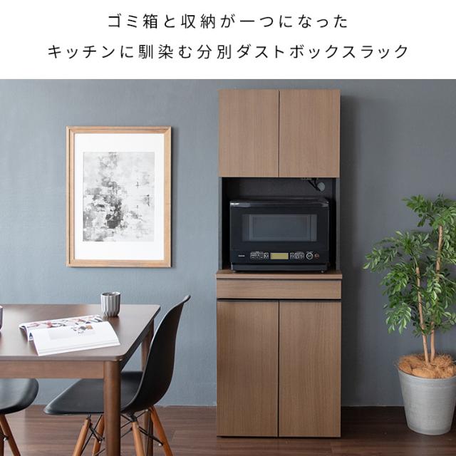電子レンジや食器、調味料が収納できるラック付きで、デッドスペースになりがちなゴミ箱上を有効活用できます。