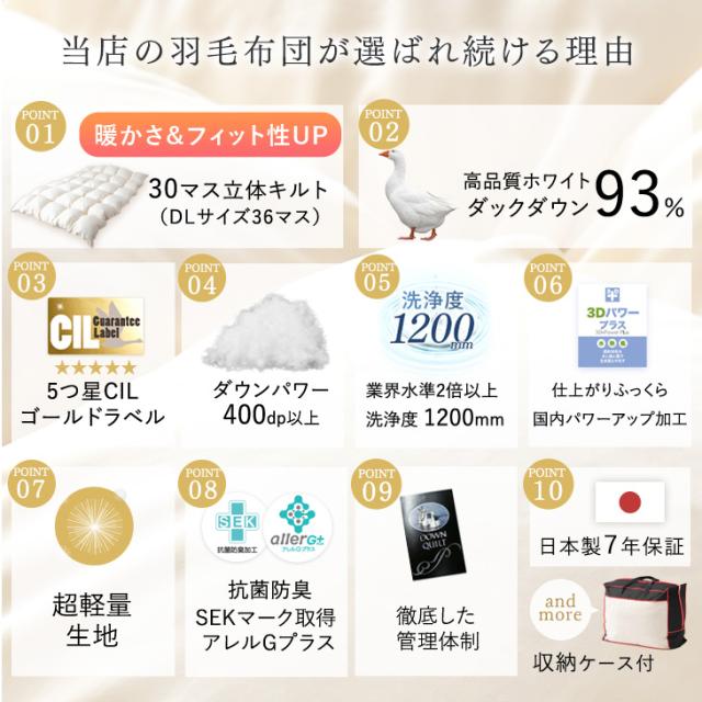 羽毛布団 クイーン ロング 日本製 ホワイト ダック ダウン93% 布団 7年保証 SEK消臭・抗菌 アレルGプラス&2倍洗浄 400dp以上 CILゴールドラベル 羽毛ふとん 羽毛 掛け布団 国産 布団 ふ 羽毛掛け布団 あったか 冬