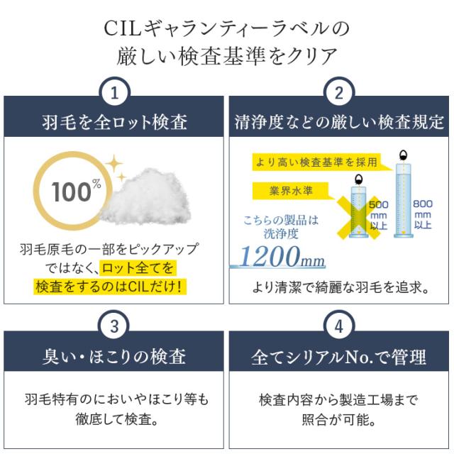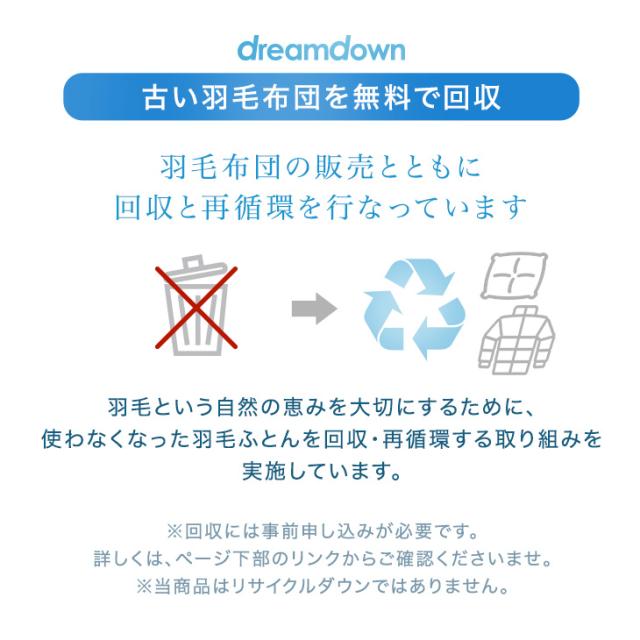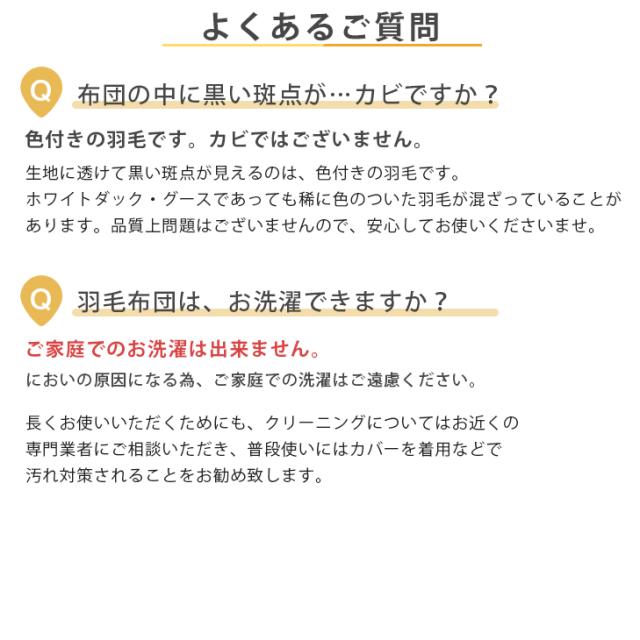 ※羽毛は天然素材のため、無臭ではございません。原毛は洗浄を十分に行っておりますが、開梱直後や温度・湿度等の環境等により臭いを感じる場合がございますので、開封直後には風通しの良い場所での十分な陰干し等をお勧めいたします。なお、天然羽毛の臭いのため人体に害はございませんのでご安心ください。