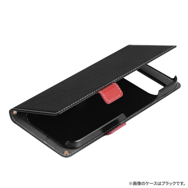 サイドベルトがバイカラーになった遊び心ある手帳型ケース/ピタッと固定できるマグネット仕様/すぐ取り出せて嵩張らないカード収納ポケット(1枚)/動画視聴に最適なスタンド機能/ショルダーストラップが使える2つのホール搭載。