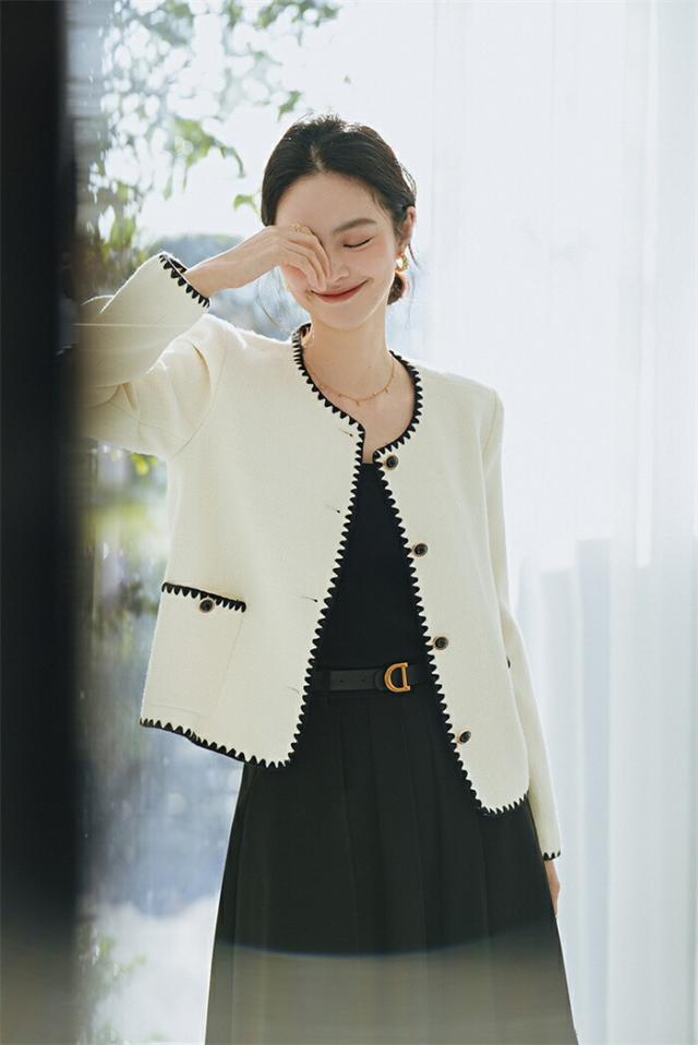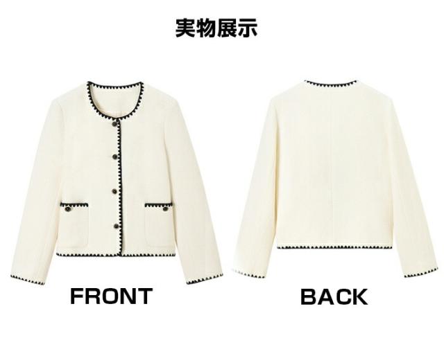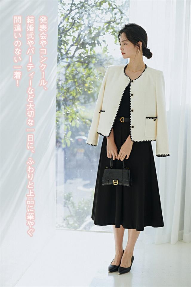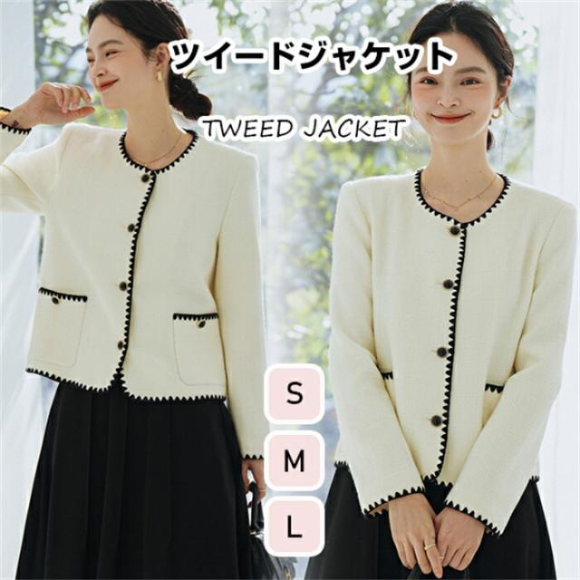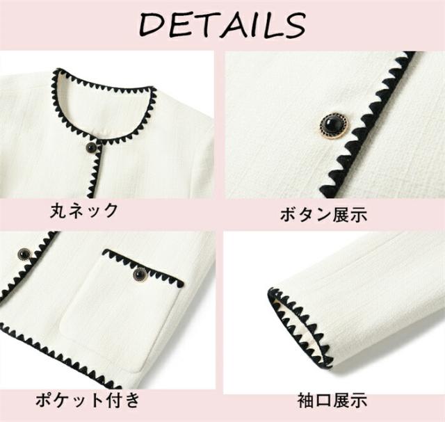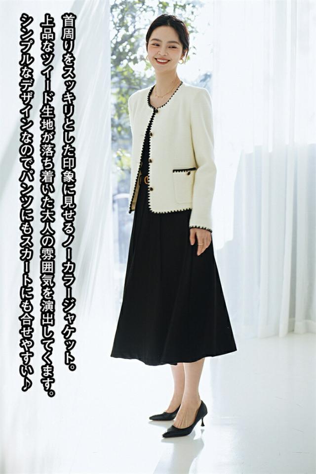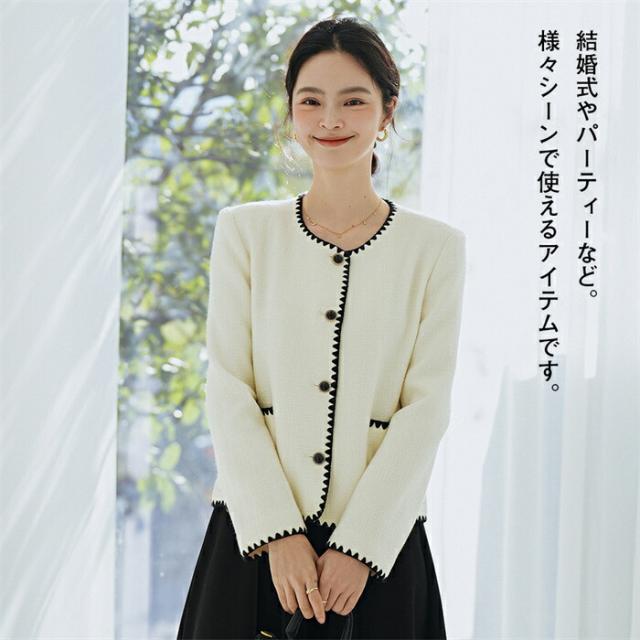 ツイードジャケット レディース 春 ジャケット アウター ショート 羽織り ノーカラージャケット ツイード 長袖 オフホワイト フォーマル ママ 母親 七五三 お宮参り ビジネス