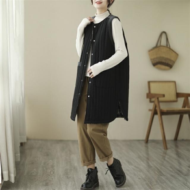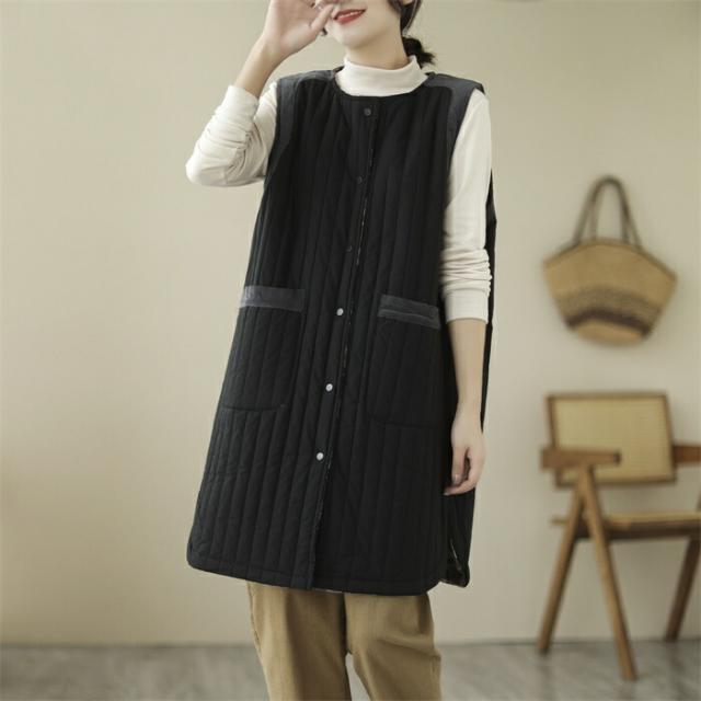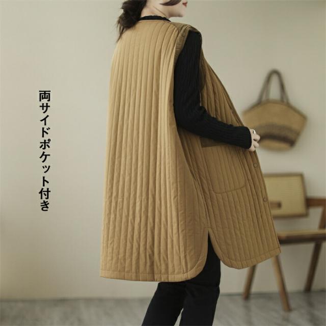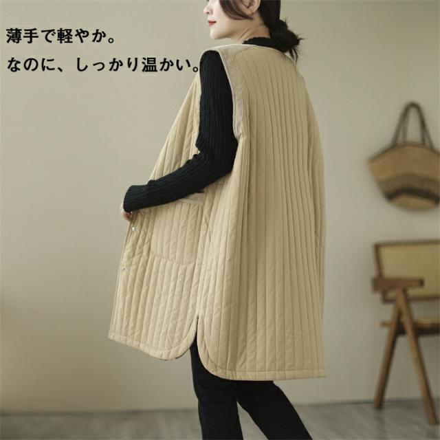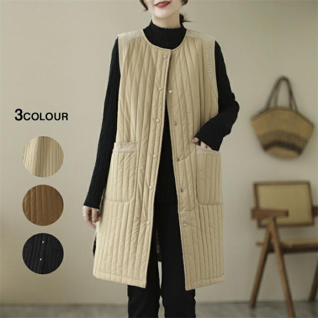 ロングベスト レディース 中綿ベスト ベスト 防寒 着痩せ コート ジャケット 前開き ノースリーブ アウター 3カラー ベージュ カーキ色 ブラック