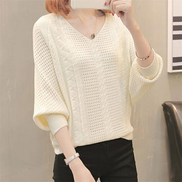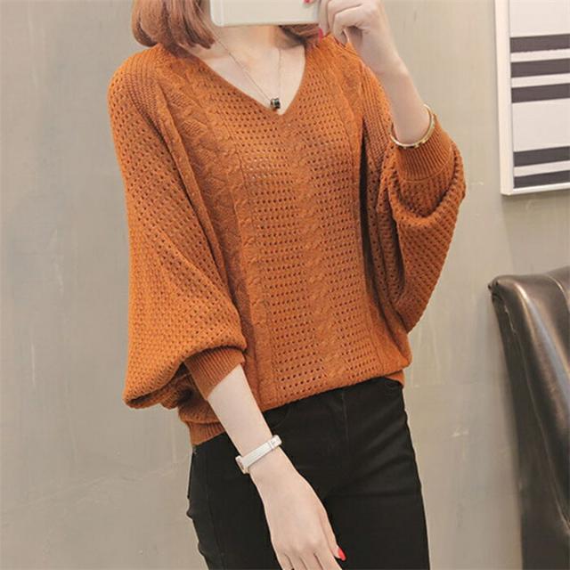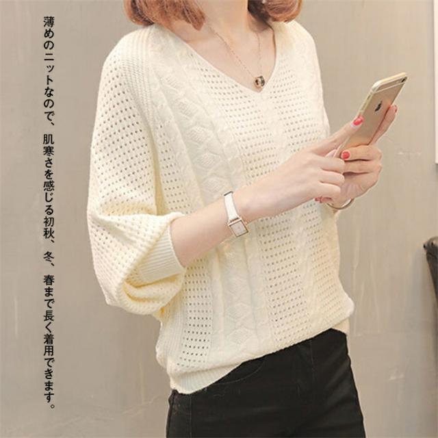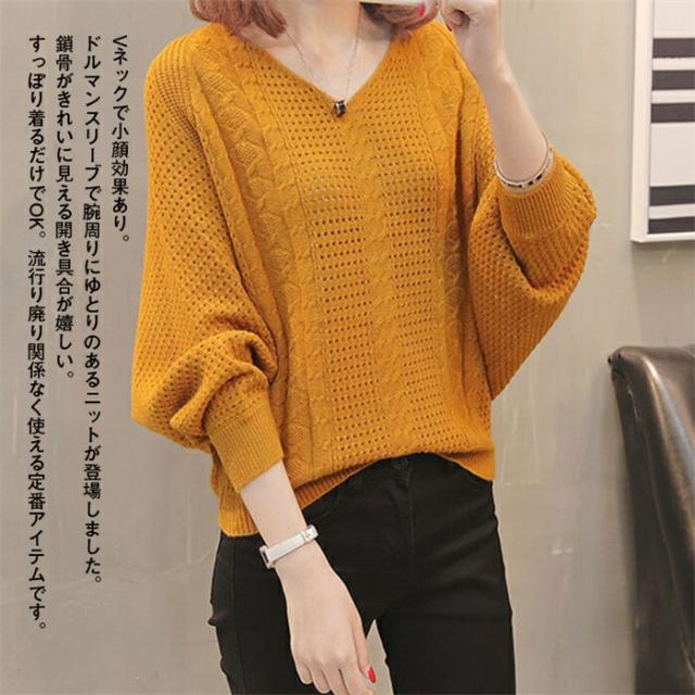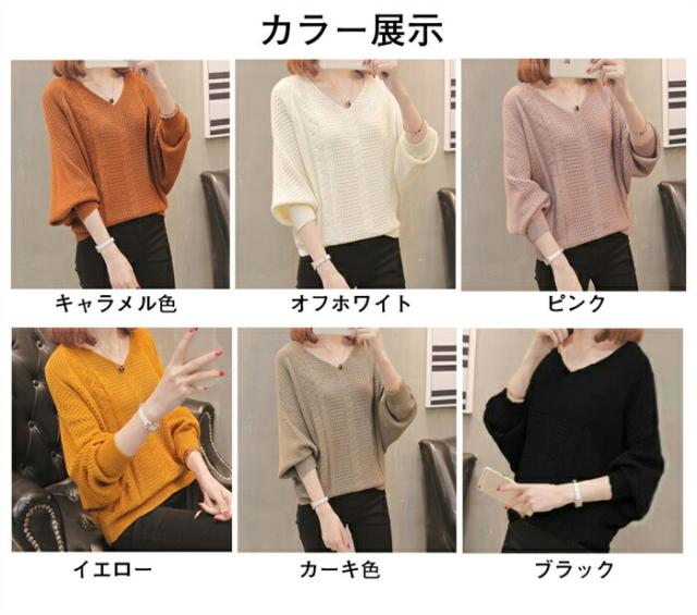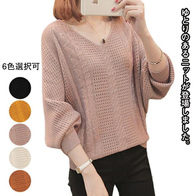 ニット Vネック かぎ編み ゆる レディース バルーンスリーブ 体型カバー キャラメル色 オフホワイト ピンク イエロー カーキ色 ブラック フリーサイズ