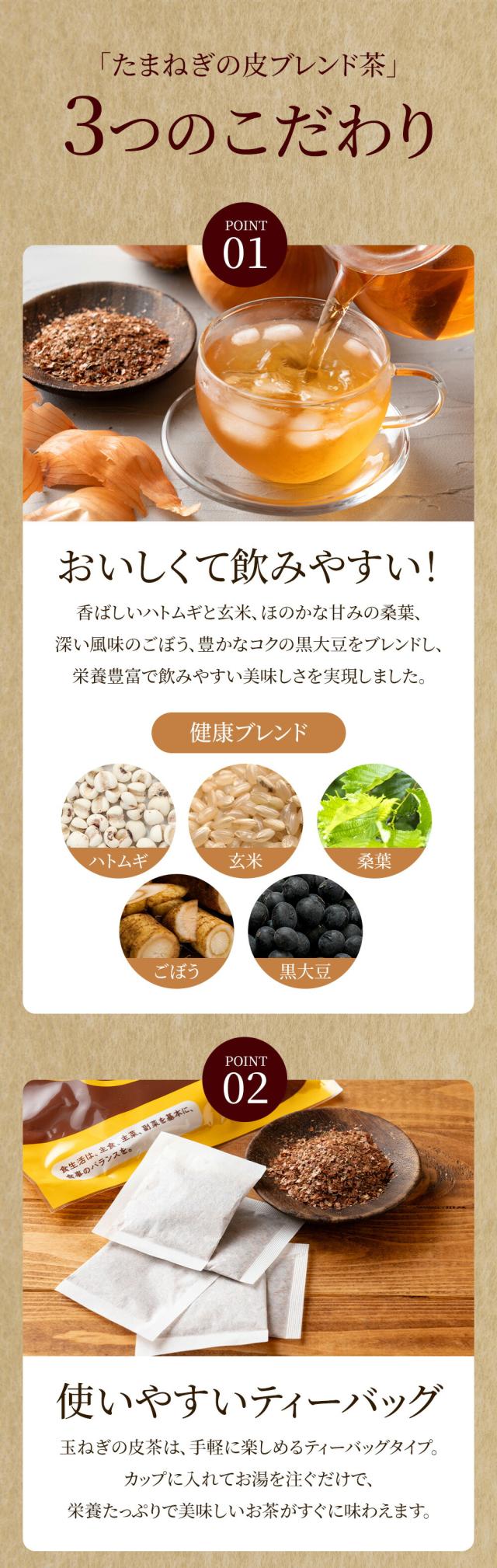 タマネギの皮(淡路島産)、ハトムギ、玄米、桑葉、ごぼう、黒大豆