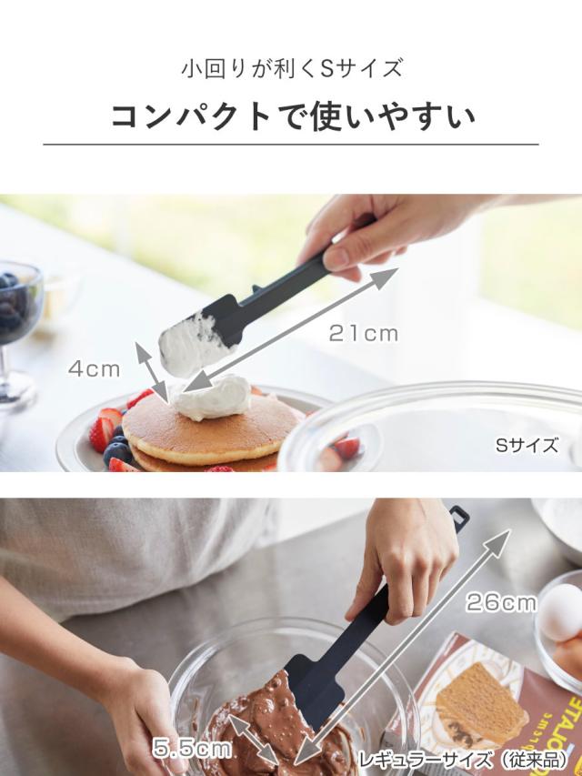 従来製品よりもひと回り小さいSサイズです。コンパクトなので、小さな鍋やボウルでも混ぜやすく、細かい作業がしやすいのがポイントです。