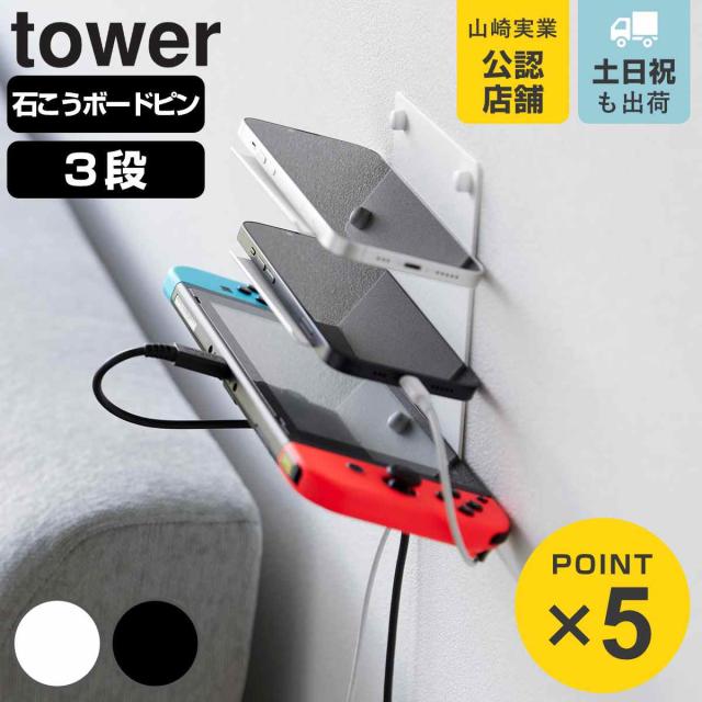 tower 山崎実業 ウォールモバイル充電&収納ラック タワー 3段 石こうボード壁対応 ( タワーシリーズ モバイルラック 収納 モバイル充電 3段ラック 石こうボード 壁面収納 浮かせて収納 山崎実業 tower)