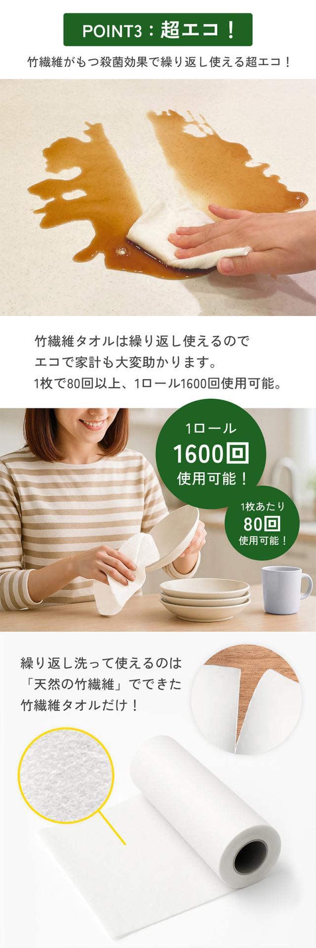 竹繊維タオル お買い得 5ロールセット 【 バツグンの吸収・吸水力 】 自然由来の細かい繊維が水分を吸収。 こぼしたソースなどもも、一拭きでキレイに吸い取れます。 【 洗ってまた使える キッチンペーパー 】 頻繁に買い替える必要がない、経済的なキッチンペーパー。 繊維に含まれる細菌やカビを抑制する効果で、衛生さも保ちます。 【 丈夫で破れにくい 】 耐久性の高いポリプロピレンを配合し、破けやすさや摩耗の体制が向上。 速乾性も強く、乾かしてすぐに再使用できます。 【 1枚でなんでもキレイに 】 コンロや家電などキッチン周りだけでなく、野菜の水切りやお掃除用の雑巾など。 使い方次第でなんでも拭ける万能タオルにもなります。 |